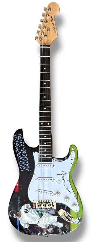 Custom Autograph Edition Stratocaster style electric guitar measures approximately 39" in length and has been hand-signed on the pickguard by Aaron Judge (New York Yankees).