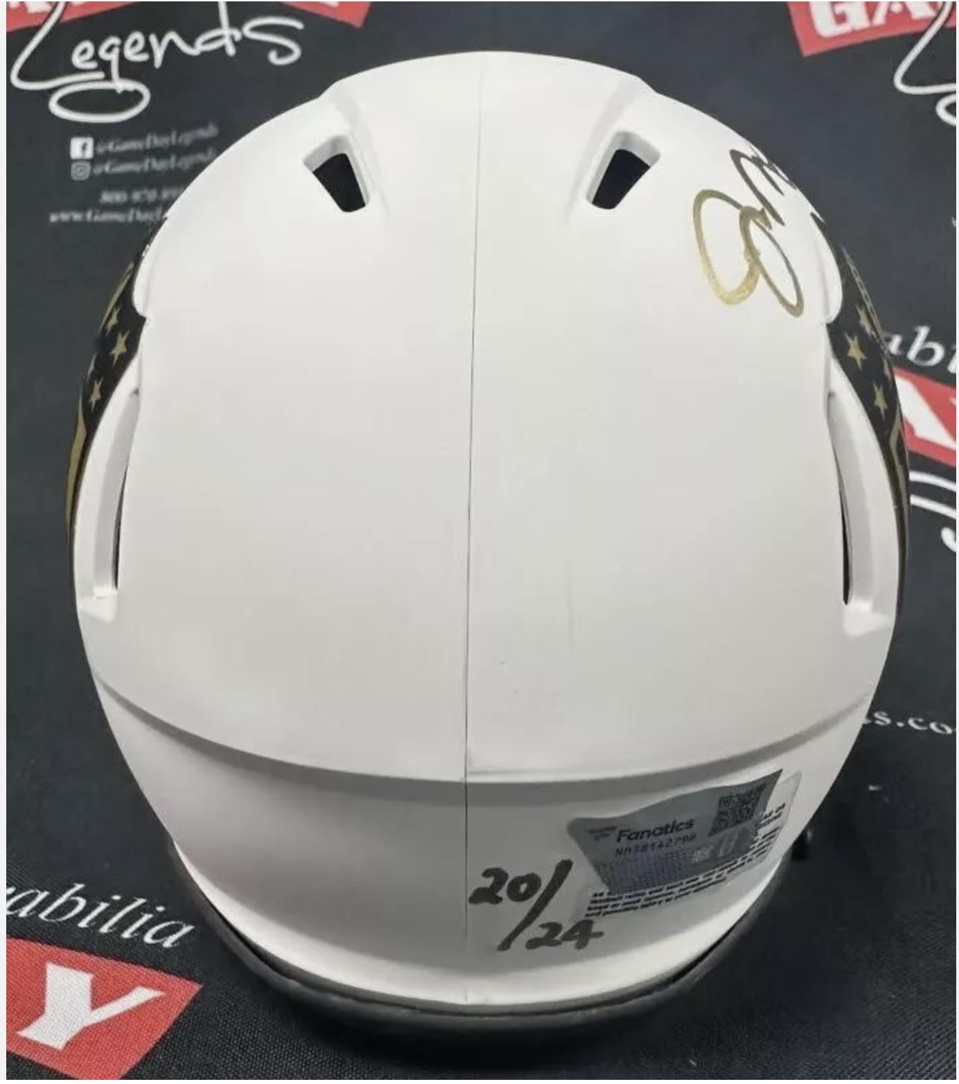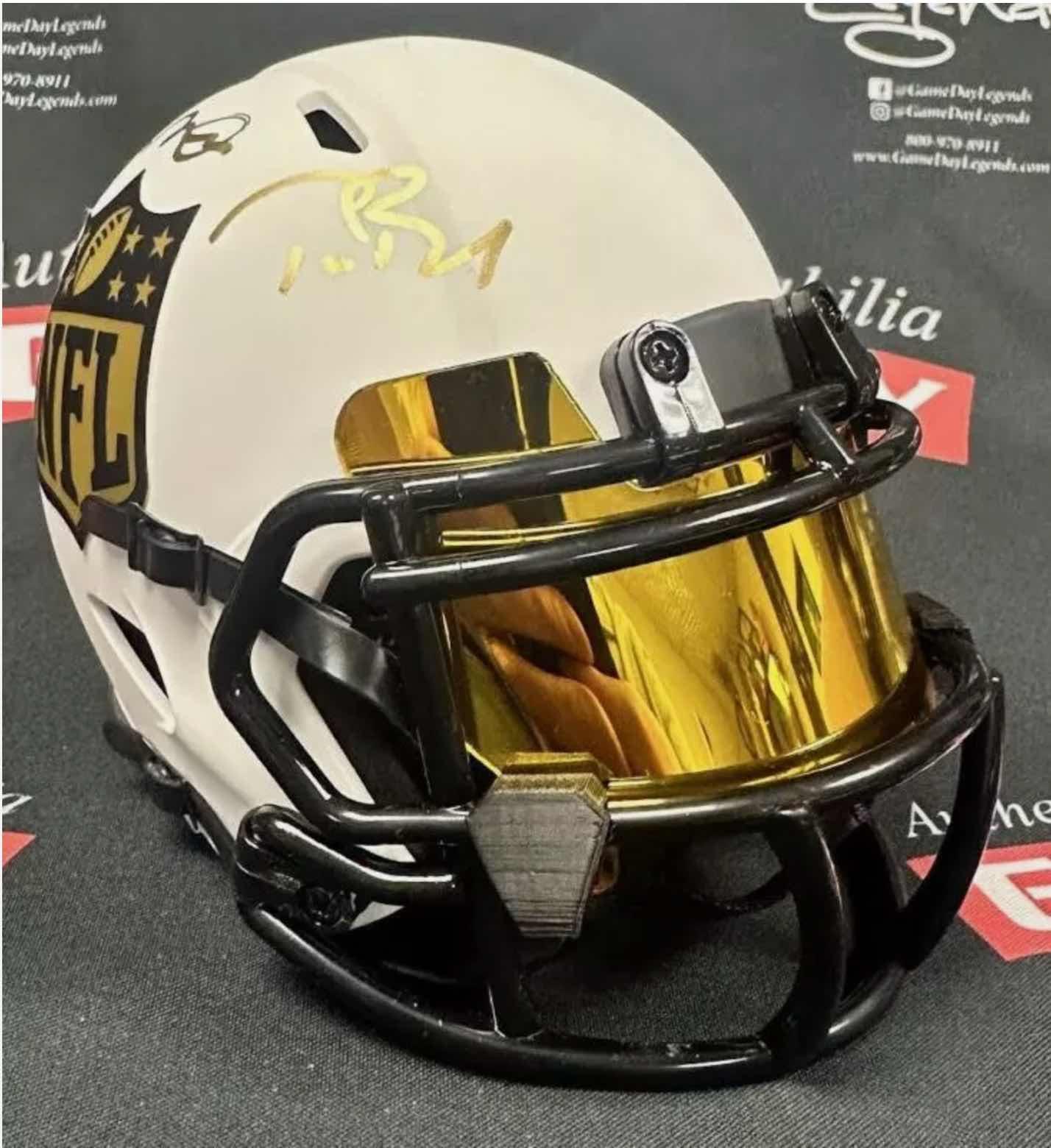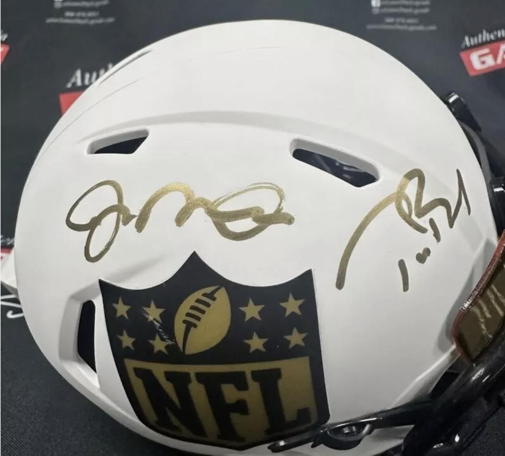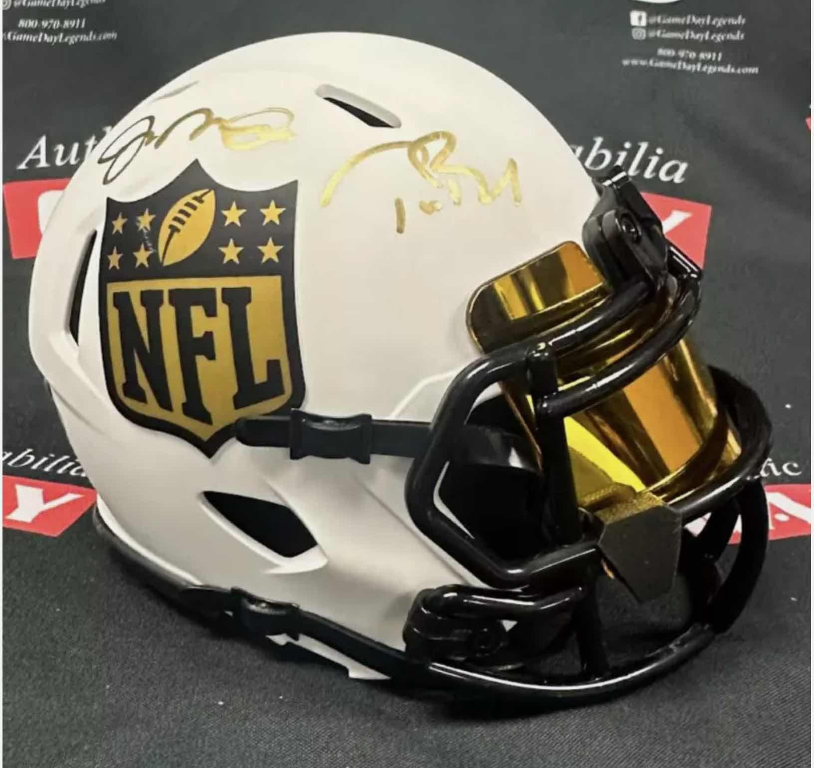 Riddell NFL Shield logo lunar eclipse alternate speed mini helmet has been hand-signed by Tom Brady (New England Patriots) and Joe Montana (San Francisco 49ers, HOF).