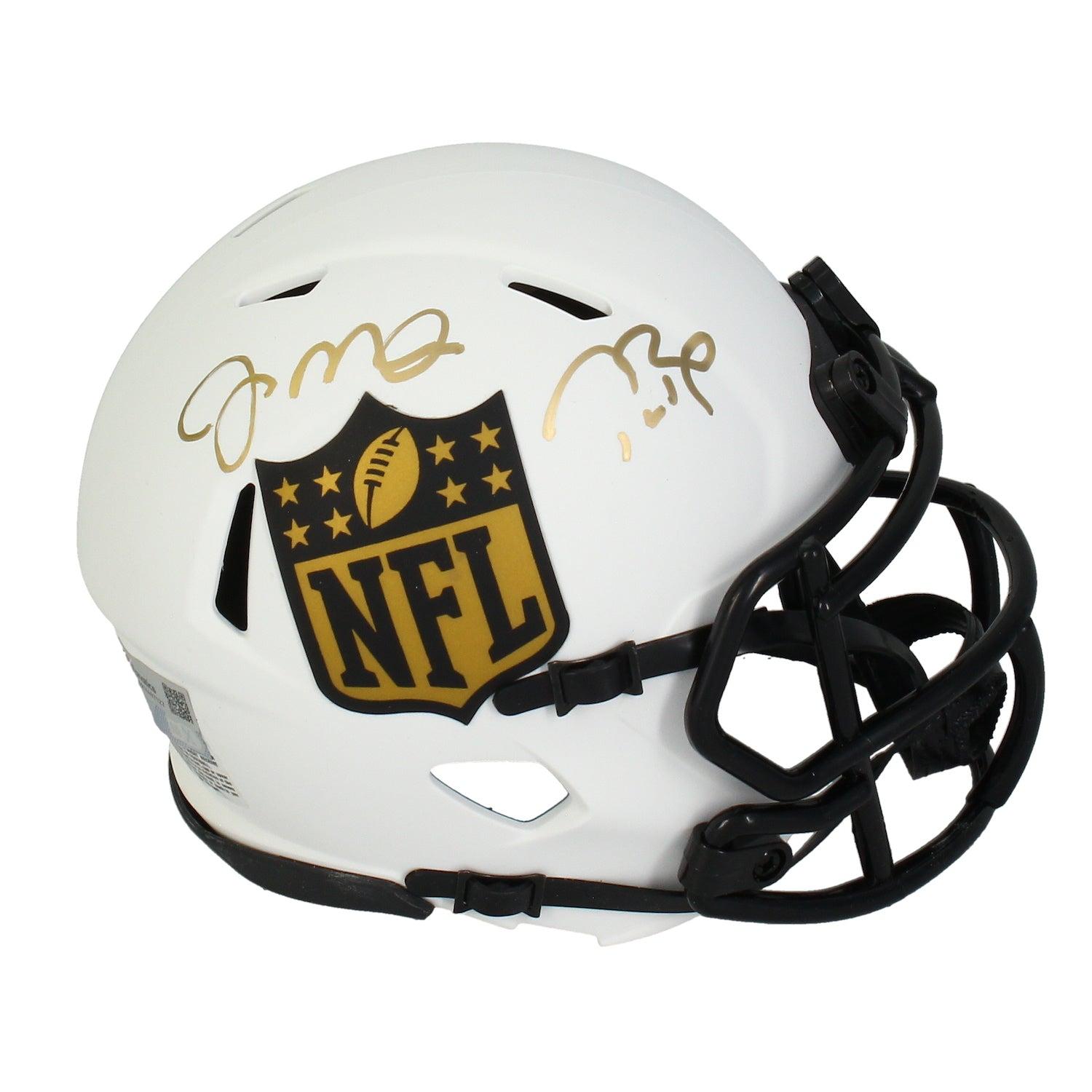 Riddell NFL Shield logo lunar eclipse alternate speed mini helmet has been hand-signed by Tom Brady (New England Patriots) and Joe Montana (San Francisco 49ers, HOF). This item is limited edition and has been numbered #24/24.