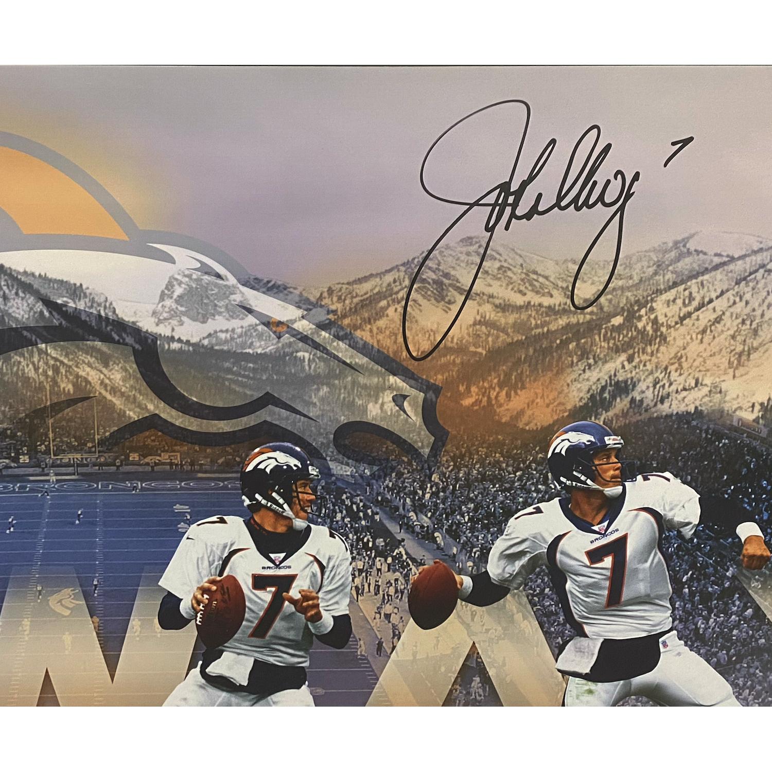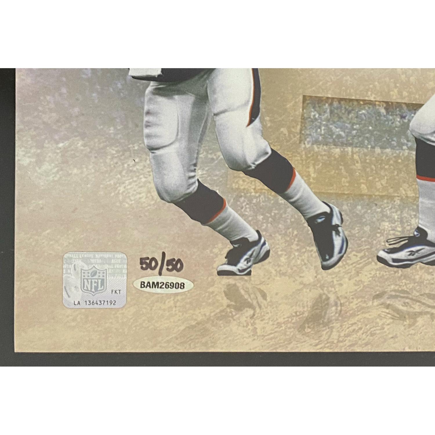 Custom frame measures 21" x 42" in size and features a "Art of The Pass" print that has been hand-signed by John Elway (Denver Broncos, HOF). This photo is limited to just 50 and you will receive number 50 from this sold out edition.
