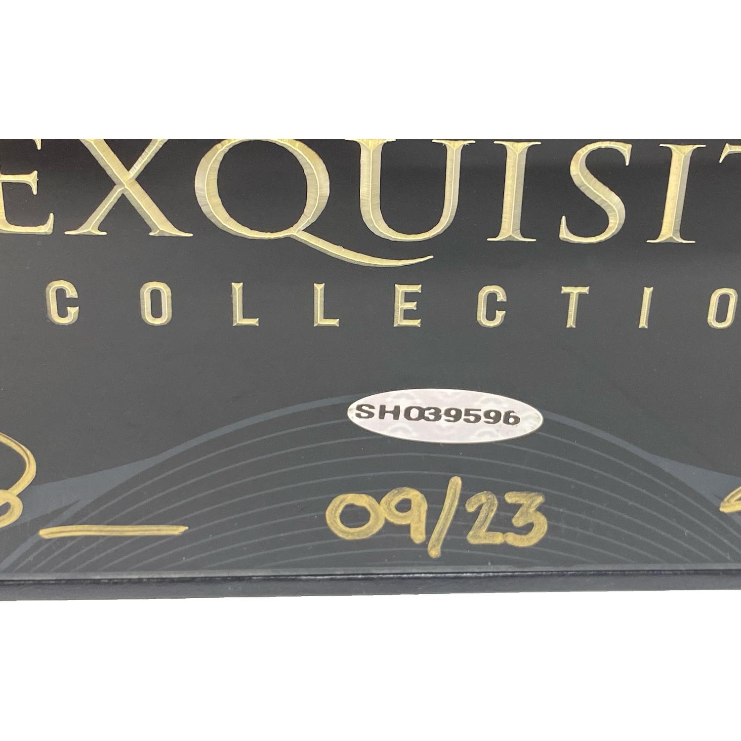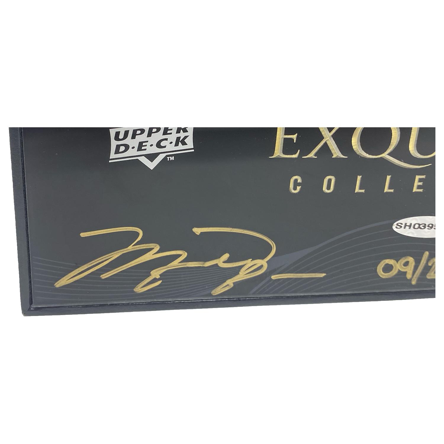 Simply put, Michael Jordan and LeBron James almost never sign the same item. While the reasons may be debatable, what is not debatable is the fact that this is truly one of the rarest autographed items in existence. This limited edition Exquisite Collection Box is hand signed by Michael Jordan and LeBron James. Upper Deck has authenticated these signatures which include a COA and hologram. Please see all the pictures as there is a slight scratch in the upper right corner. We enhanced this image to show it clearly but in person it is not nearly as noticeable.