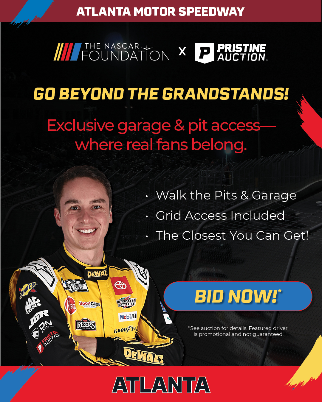 Atlanta Motor Speedway delivers some of the fastest racing on the NASCAR schedule. Garage and pit access places you steps from the action throughout race weekend. Inventory is limited.
