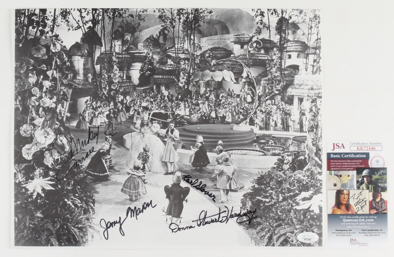 Photo measures 11" x 14" in size and has been hand-signed by Karl Slover (D. 2011), Mickey Carroll (D. 2009), Jerry Maren (D. 2018), and Donna Stewart-Hardaway (D. 2008).