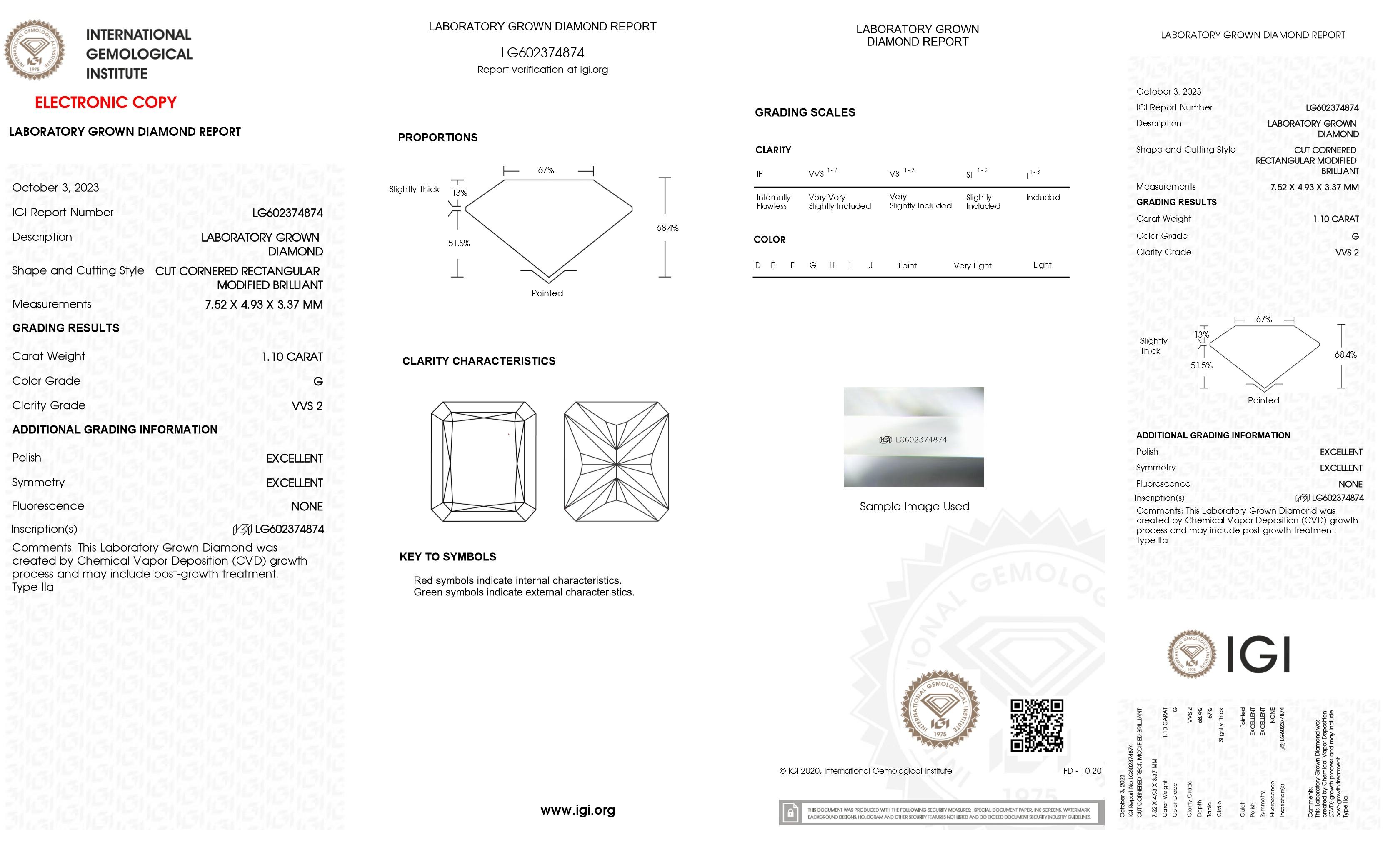 1.10 Carats Lab Grown Diamond Loose G, VVS2 | Estimated Retail Value: $1,650 (UGL & IGI Certs)
