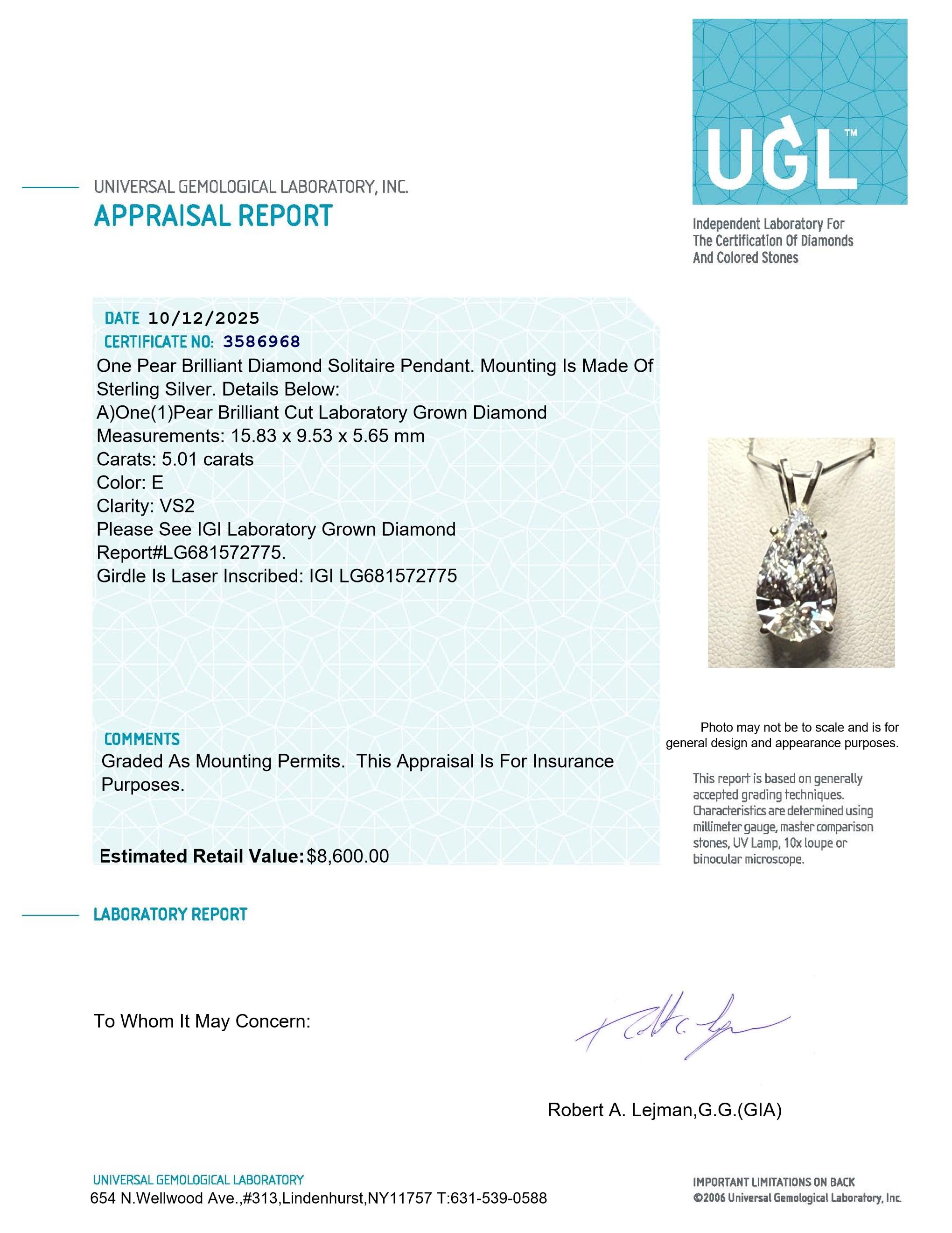 5.01 Carats Lab Grown Diamond Pendant E, VS2 | Pear Cut | $8,600 Estimated Retail Value (UGL & IGI Certs) | Brand New