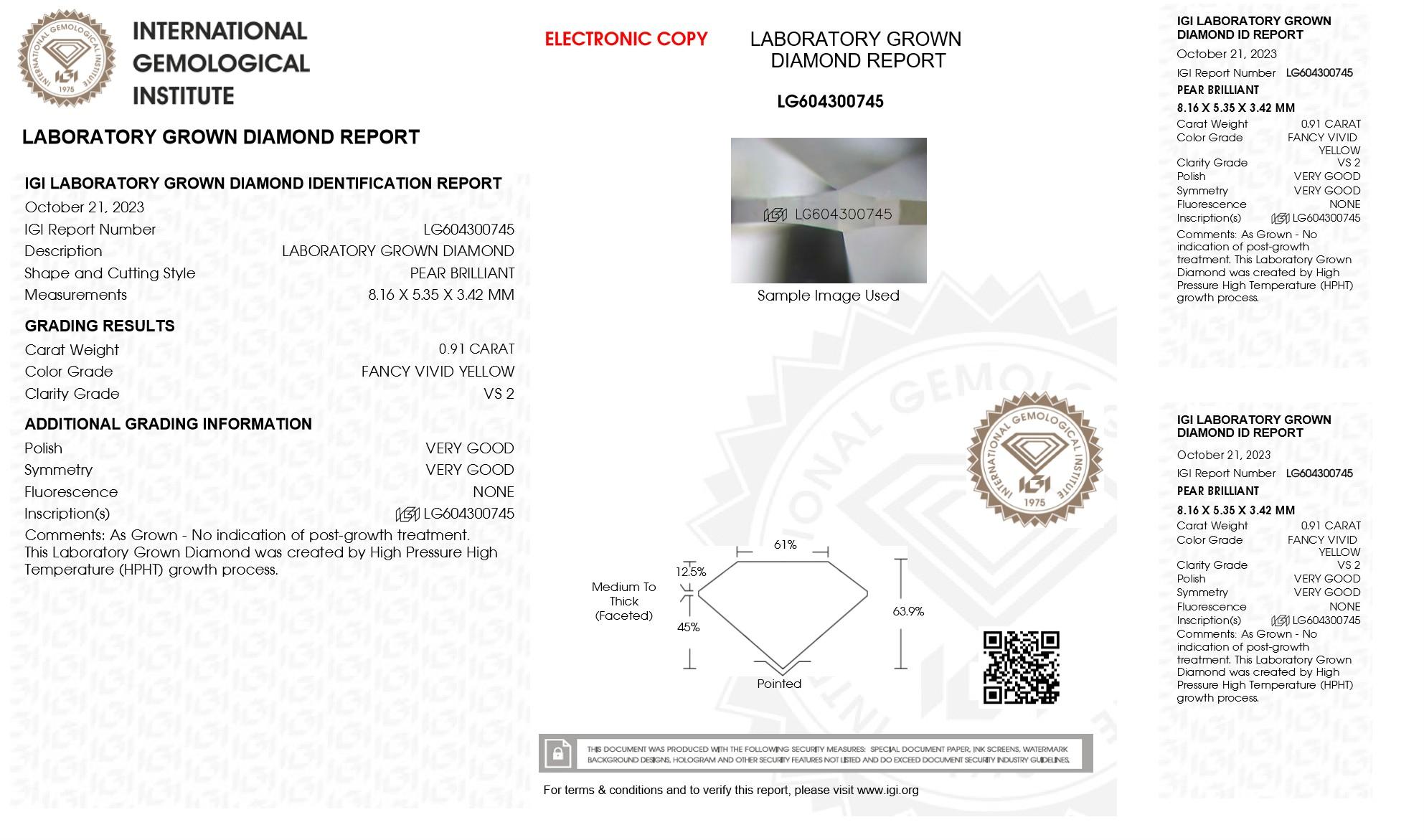 .91 Carats Lab Grown YELLOW Diamond Loose VS2 | (IGI Cert)