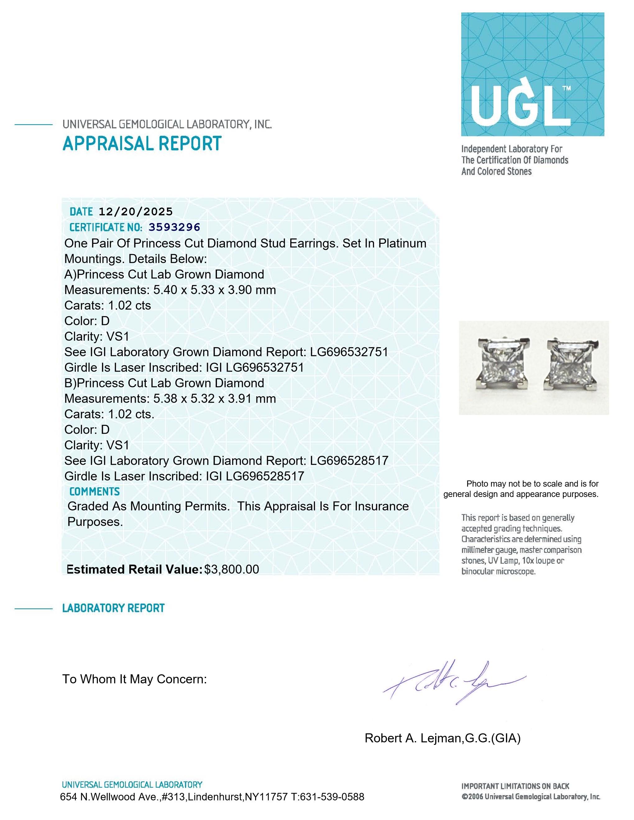 Platinum 2.04 Carats Lab Grown Diamond Stud Earrings D, VS1 | $3,800 Estimated Retail Value (UGL & IGI Certs) | Brand New