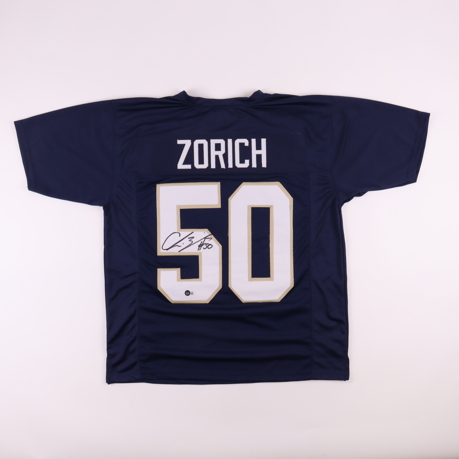 Custom on-field style jersey. Everything sewn on, size XL. Hand-signed by Chris Zorich.