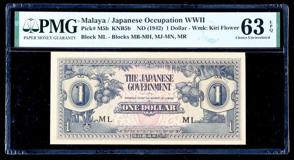 ND (1942) Malaya / Japanese Occupation WWII - 1 Dollar (PMG Choice Uncirculated 63 EPQ)