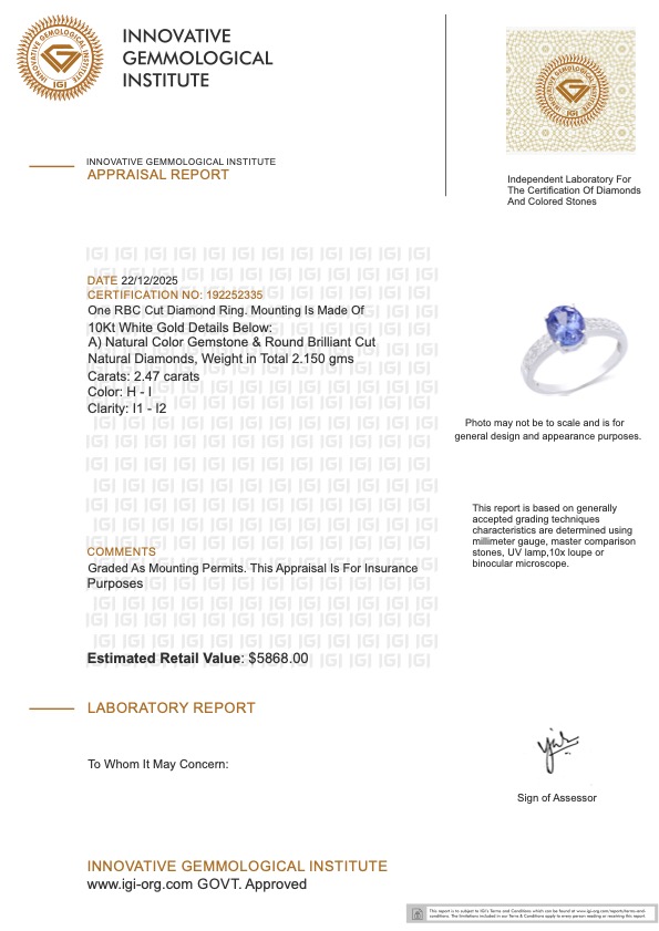 This piece includes paperwork from the Innovative Gemological Institute (IGI).