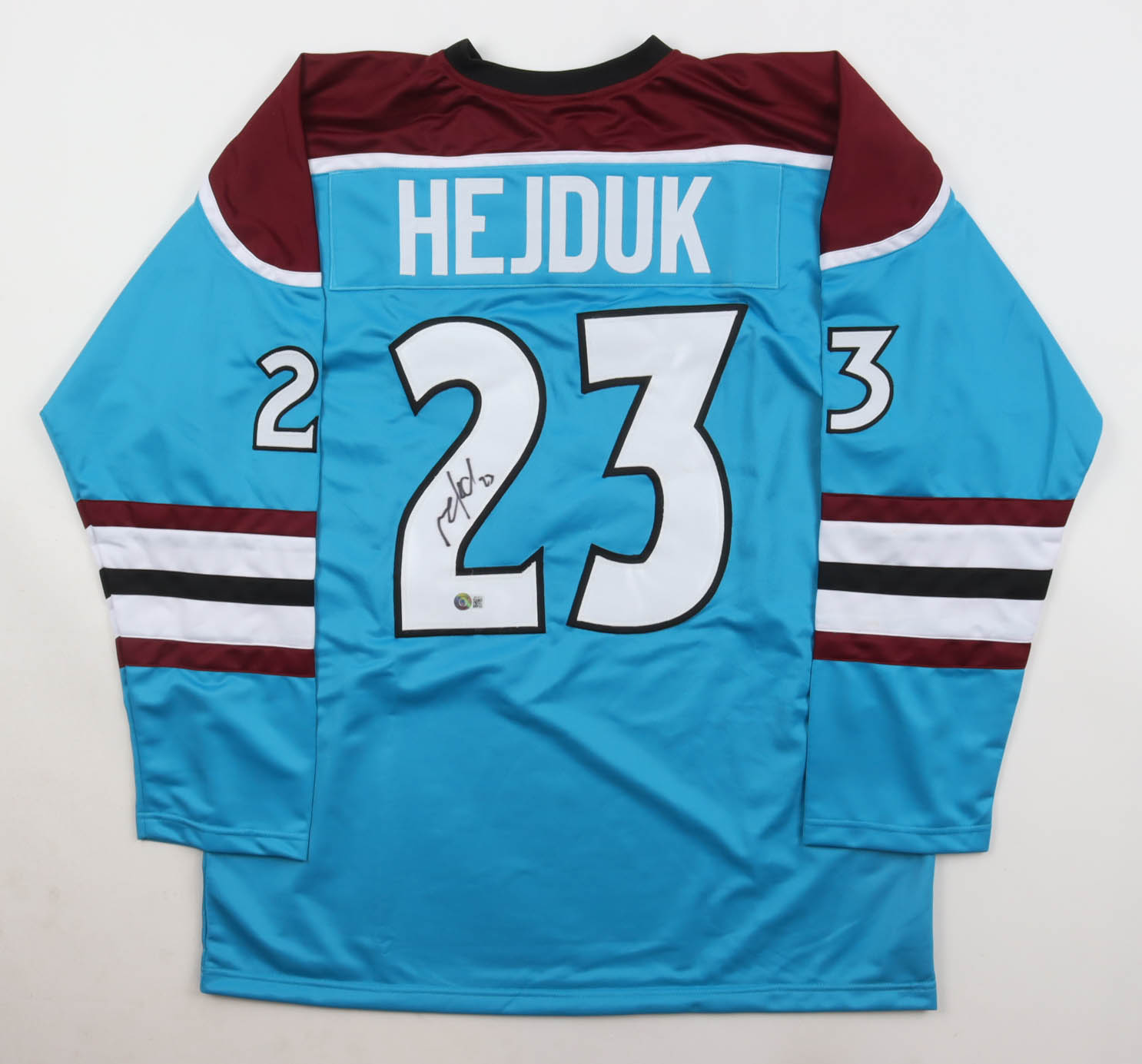 Custom jersey with everything sewn on, size XL. Hand-signed by Milan Hejduk (Colorado Avalanche).