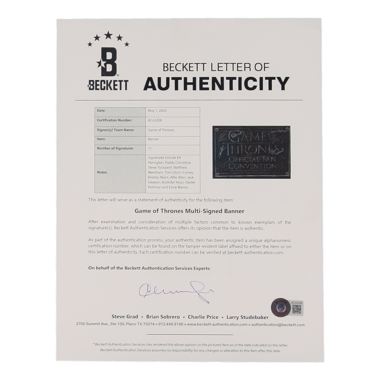 Banner measures 12” x 18” in size and has been hand-signed by the cast of "Game of Thrones" with Kit Harington, Paddy Considine, Steve Toussaint, Matthew Needham, Tom Glynn-Carney, Kristian Nairn, Alfie Allen, Jack Gleeson, Kristofer Hivju, Daniel Portman and Esme Bianco