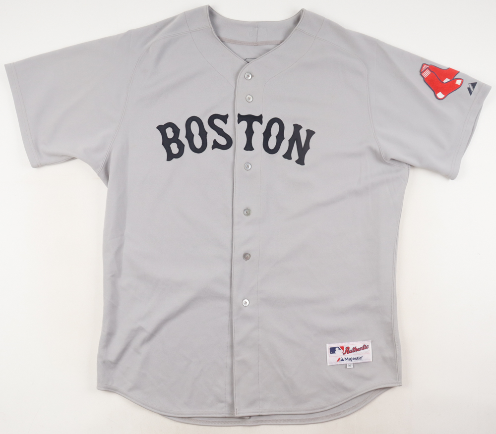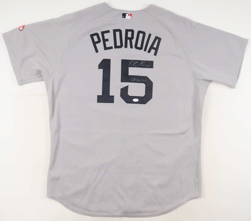 Majestic authentic jersey with everything sewn on, size 52. Hand-signed and inscribed by Dustin Pedroia.