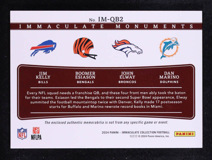 Jim Kelly / Boomer Esiason / John Elway / Dan Marino 2024 Panini Immaculate Collection Monuments Quad Relic #IM-QB2 #48/49