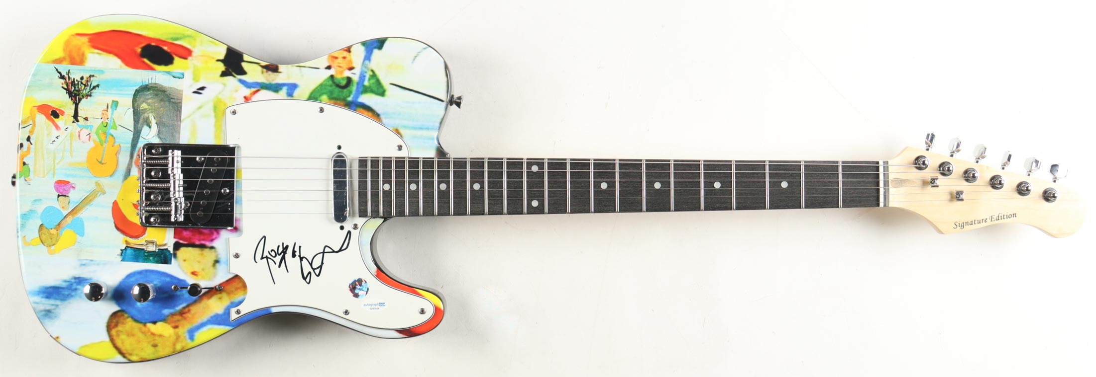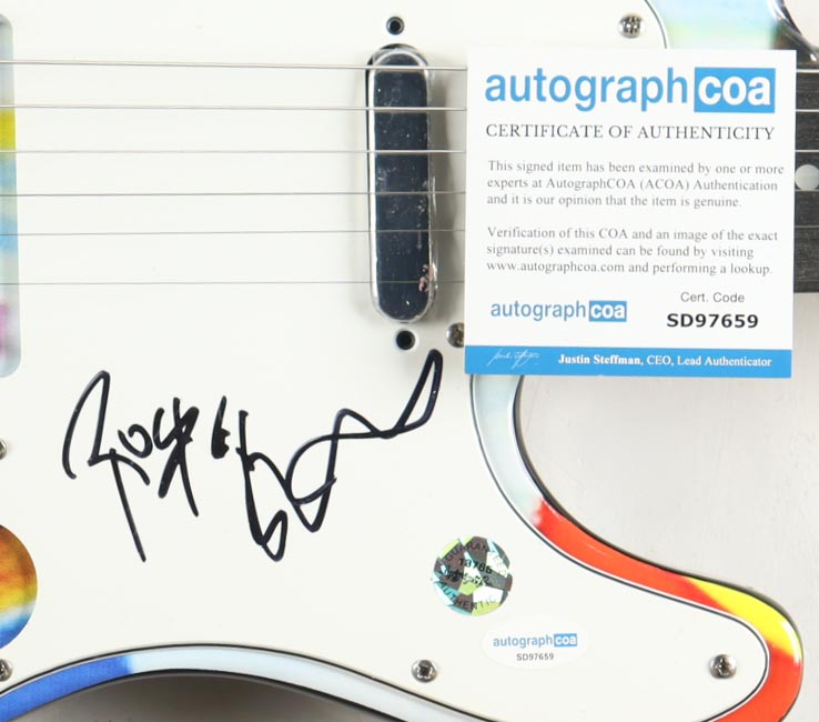 Custom Autograph Edition Stratocaster style electric guitar measures approximately 39" in length and has been hand-signed on the pickguard by Robbie Robertson (lead guitarist & vocalist).