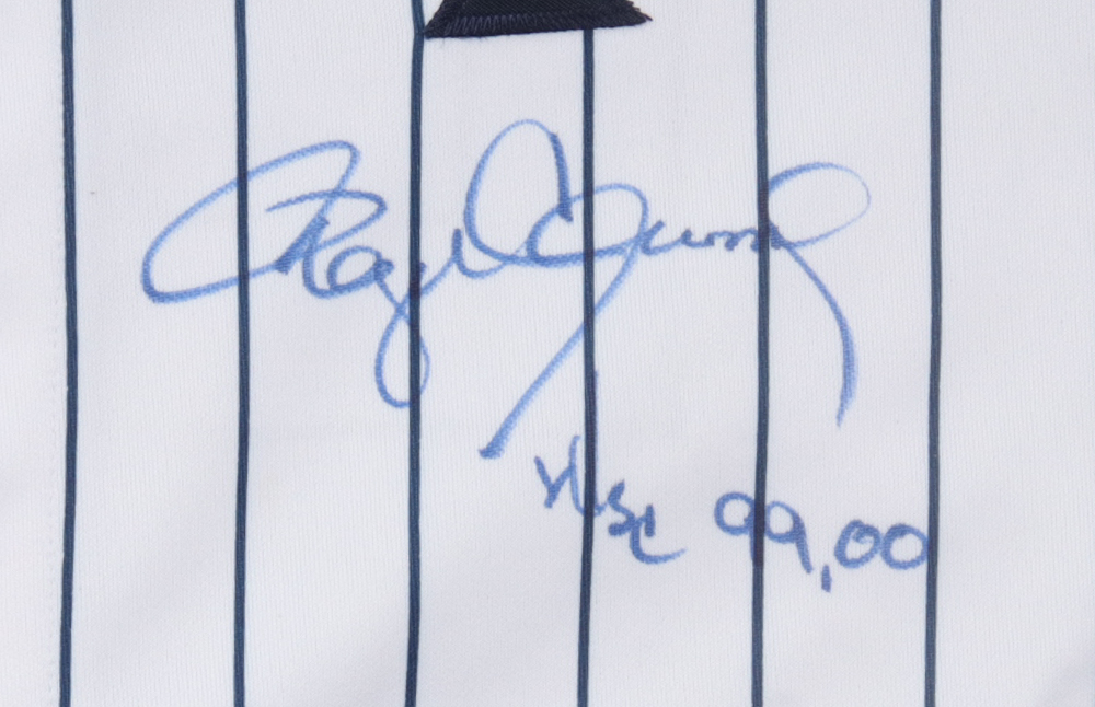 Majestic authentic jersey with everything sewn on, size XL. Hand-signed and inscribed by Roger Clemens (New York Yankees).