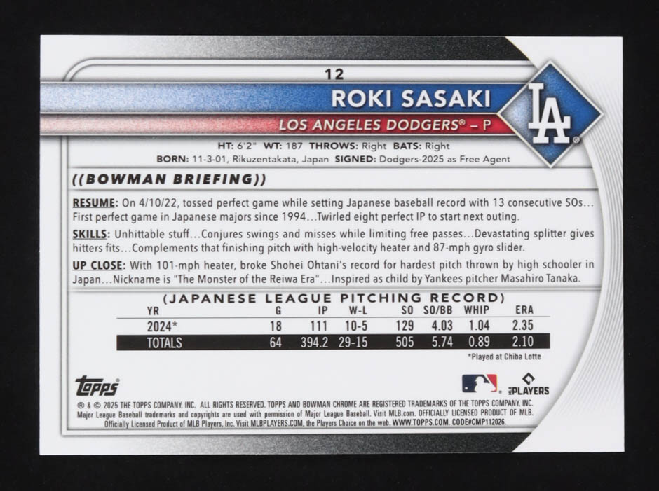 Roki Sasaki 2025 Bowman Chrome Purple Geometric Refractors #12 #216/250 RC
