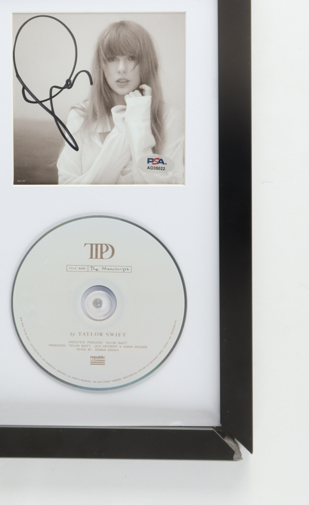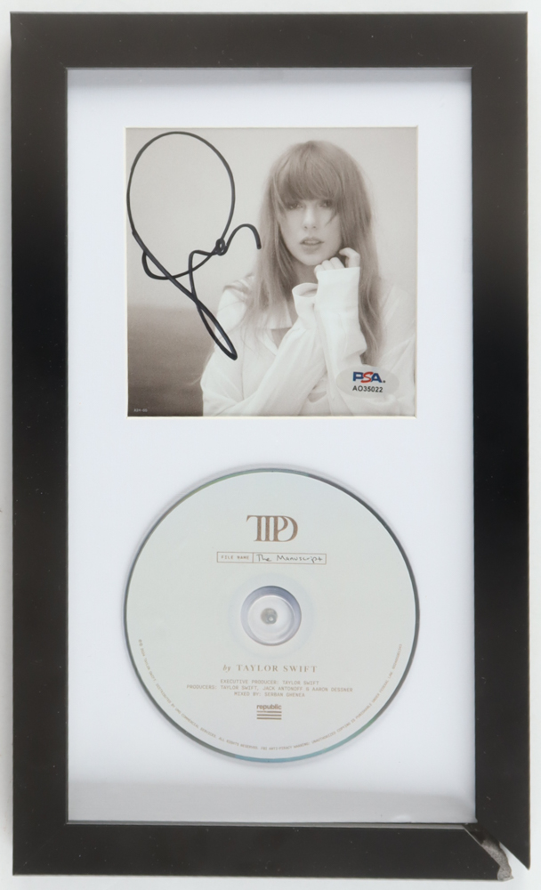 Custom frame measures approximately 8" x 13.5" in size. Features a "The Torture Poets Department" CD insert that has been hand-signed by Taylor Swift and includes the disc as shown. Please note, the edge of the frame is broken.