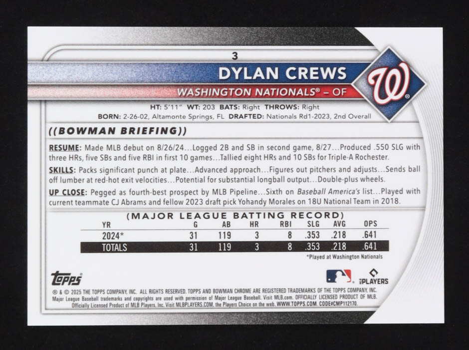 Dylan Crews 2025 Bowman Chrome Etched in Glass Variations #3 RC