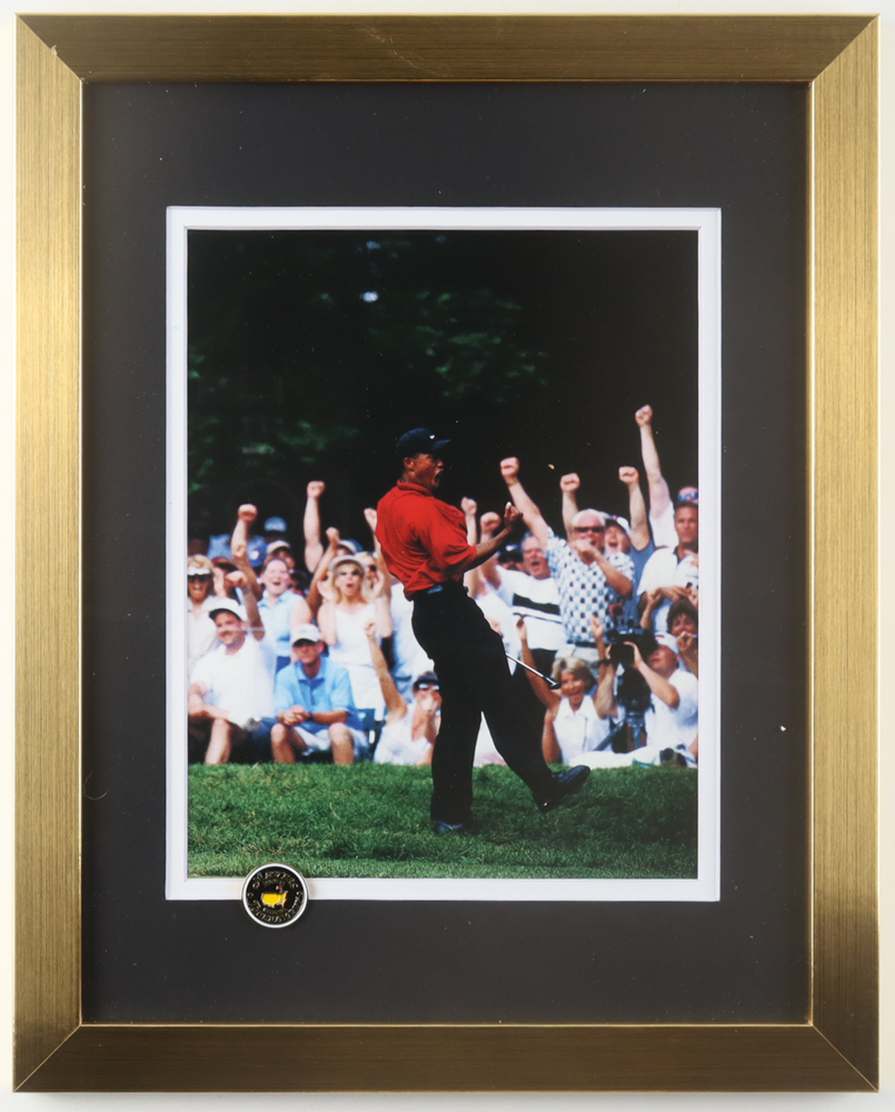 Custom frame measures approximately 13" x 16" in size and features an unsigned photo depicting Tiger Woods (HOF) Winning the Masters. Display also includes an official black Masters Tournament pin. Please note, the photo is unsigned.