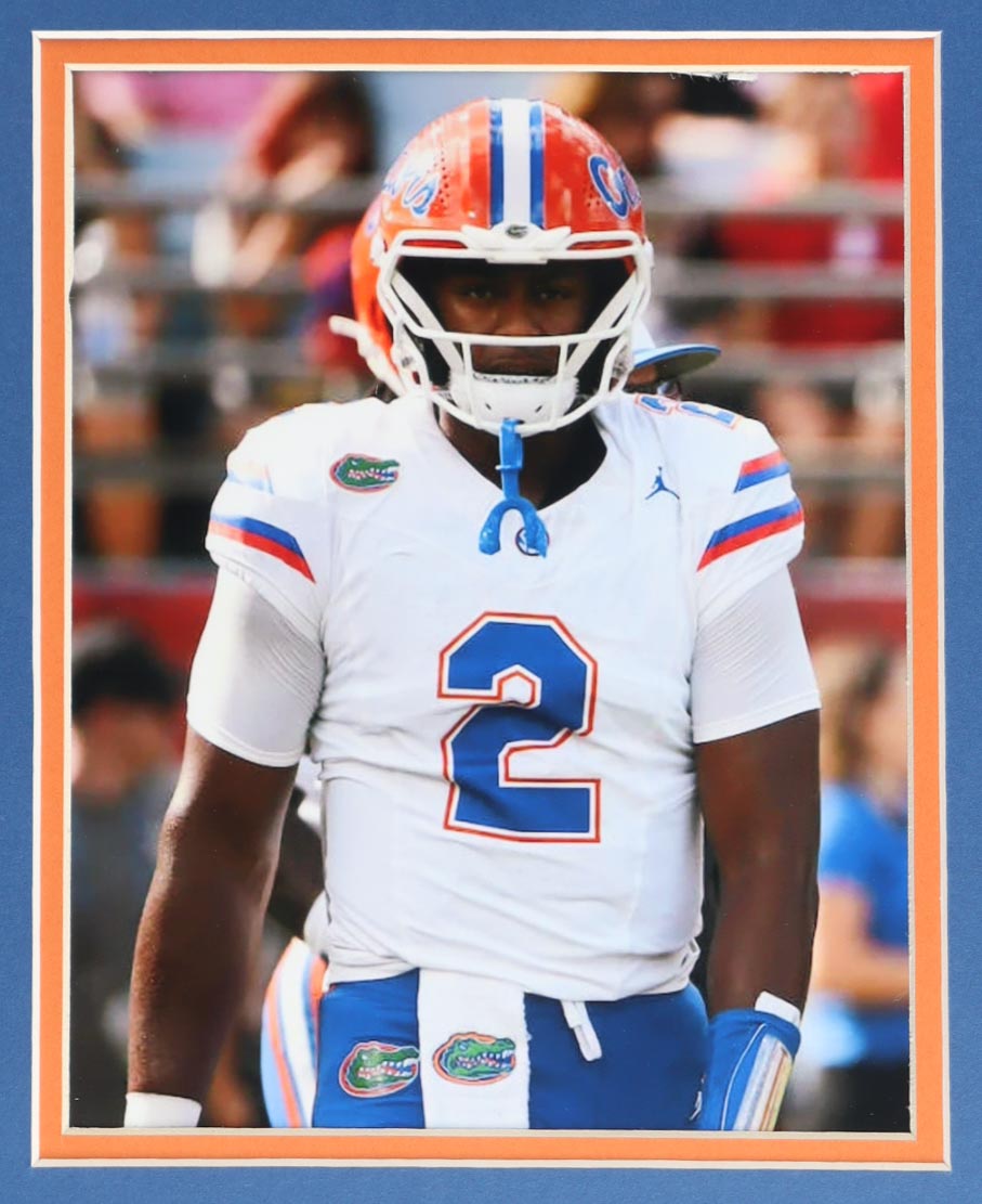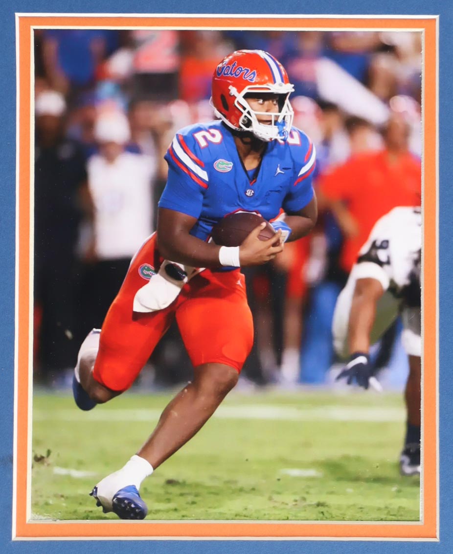 Custom frame measures 35" x 43" in size and features a jersey hand-signed by DJ Lagway. The display also included (2) 8" x 10" photos. Please note that the 8" x 10" photos may be in reverse order.