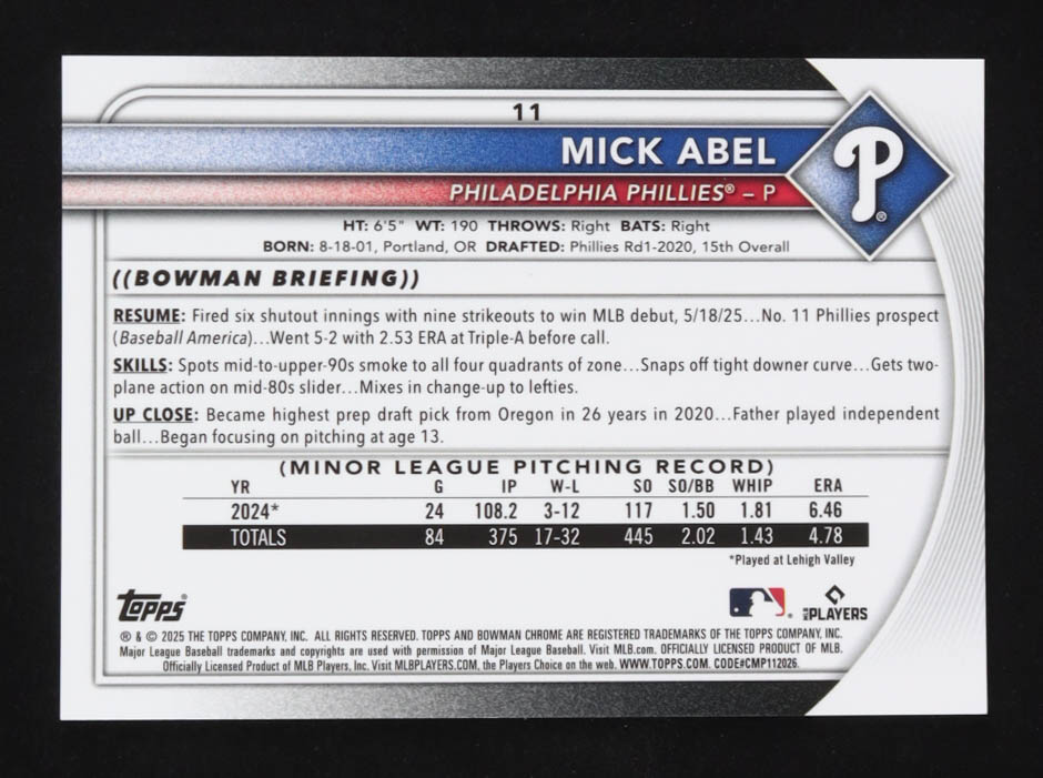 Mick Abel 2025 Bowman Chrome Sapphire Orange Refractors #11 #07/25 RC