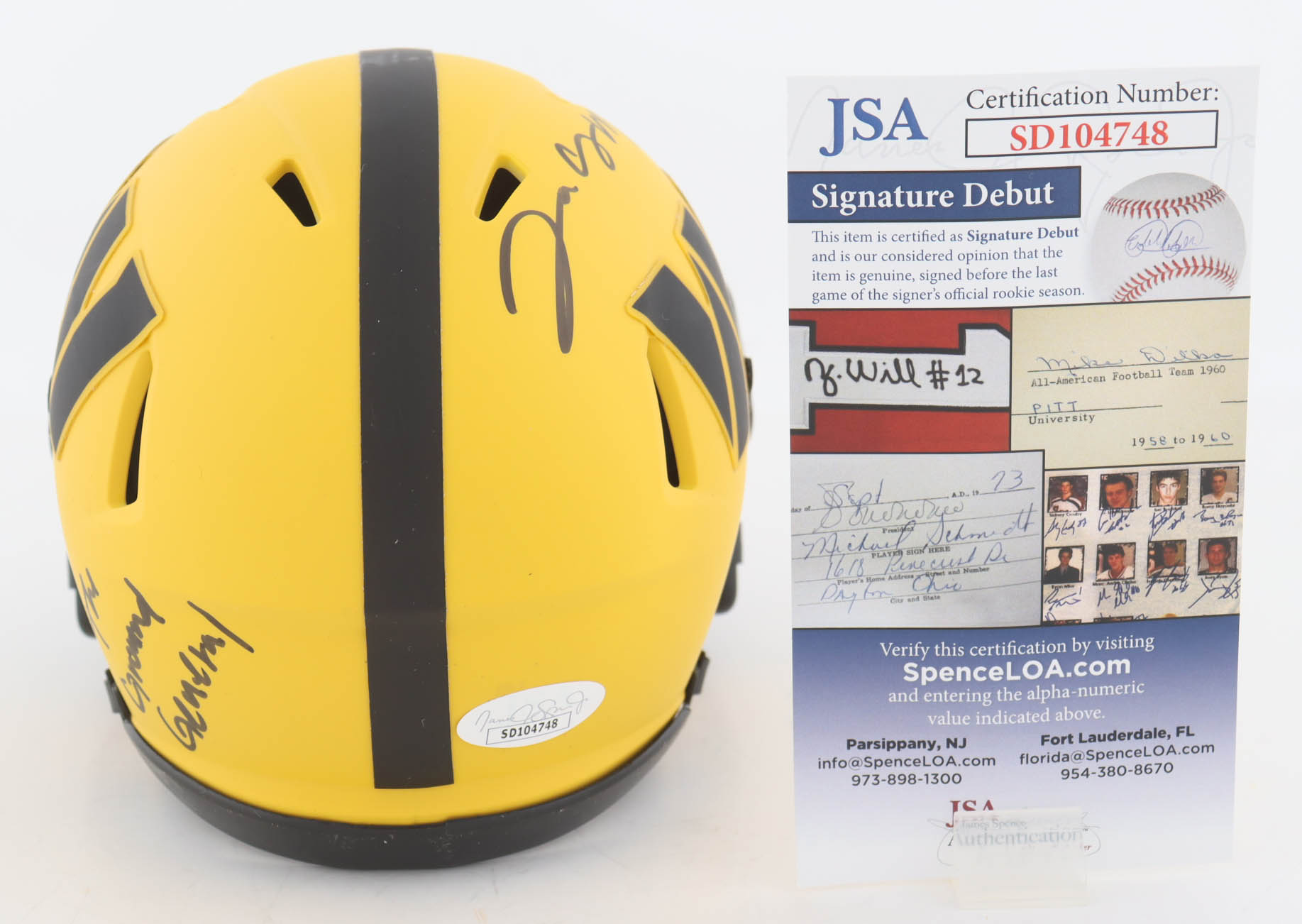 The autograph(s) includes an official James Spence Authentication (JSA) "Signature Debut" hologram and COA. "Signature Debut" is the autographed memorabilia equivalent to a rookie card. The JSA definition of a "Signature Debut" is as follows: "Any item that is autographed and received by JSA prior to the last game of the signer's official rookie season.