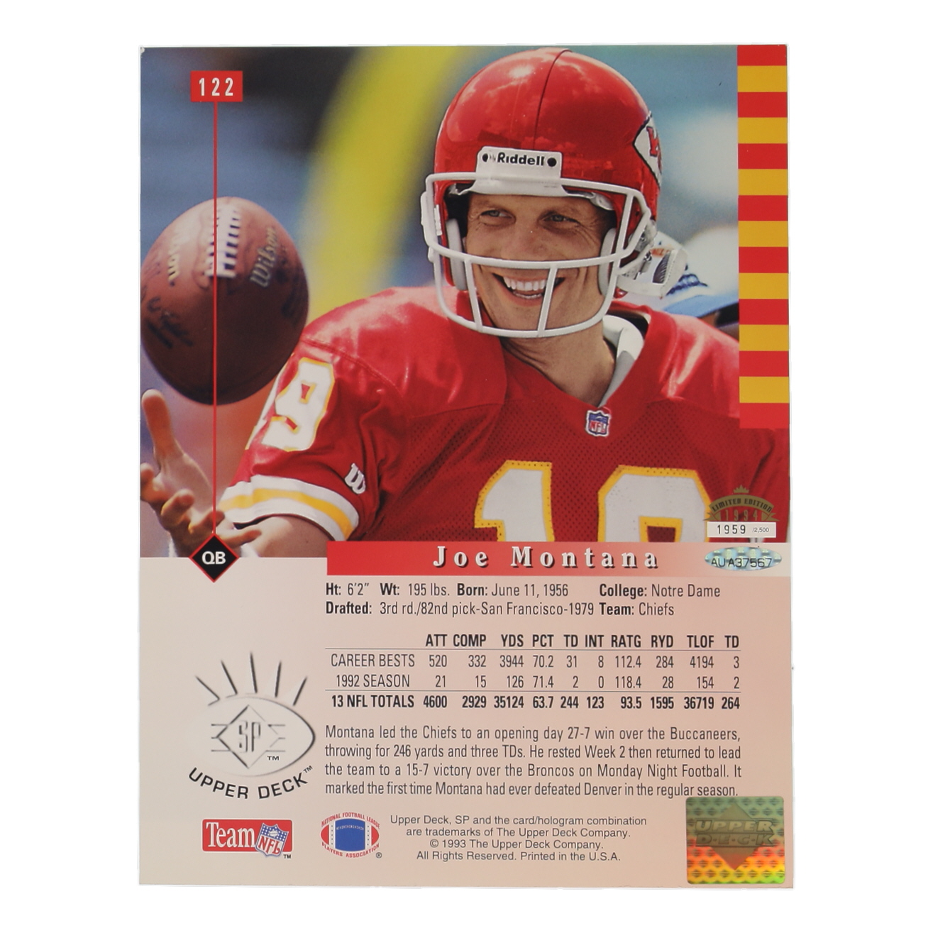 Joe Montana Signed 1993 Upper Deck #122 8x10 Card #131/500 (UDA)