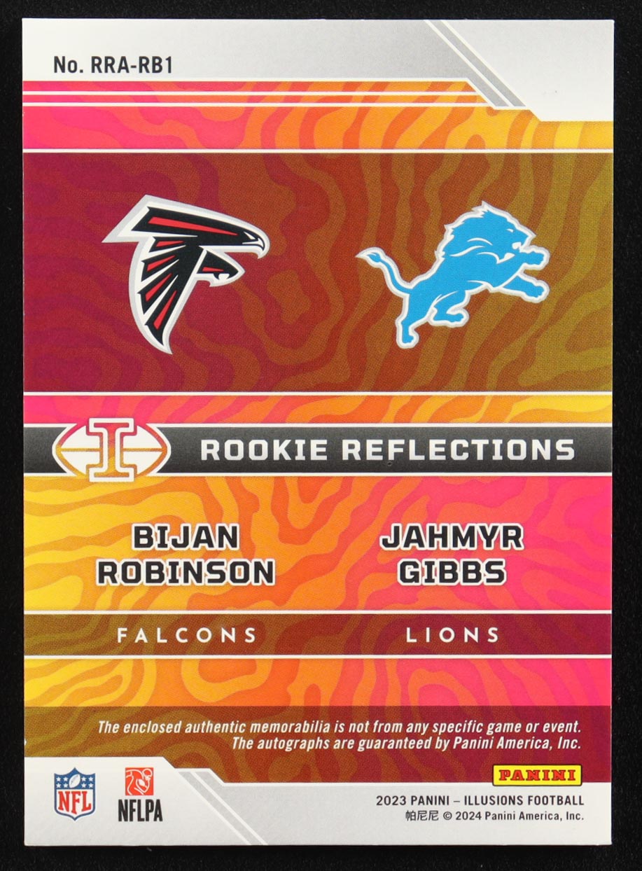 Bijan Robinson / Jahmyr Gibbs 2023 Panini Illusions Rookie Reflections Dual Patch Autographs Red #13 EXCH #02/50 RC