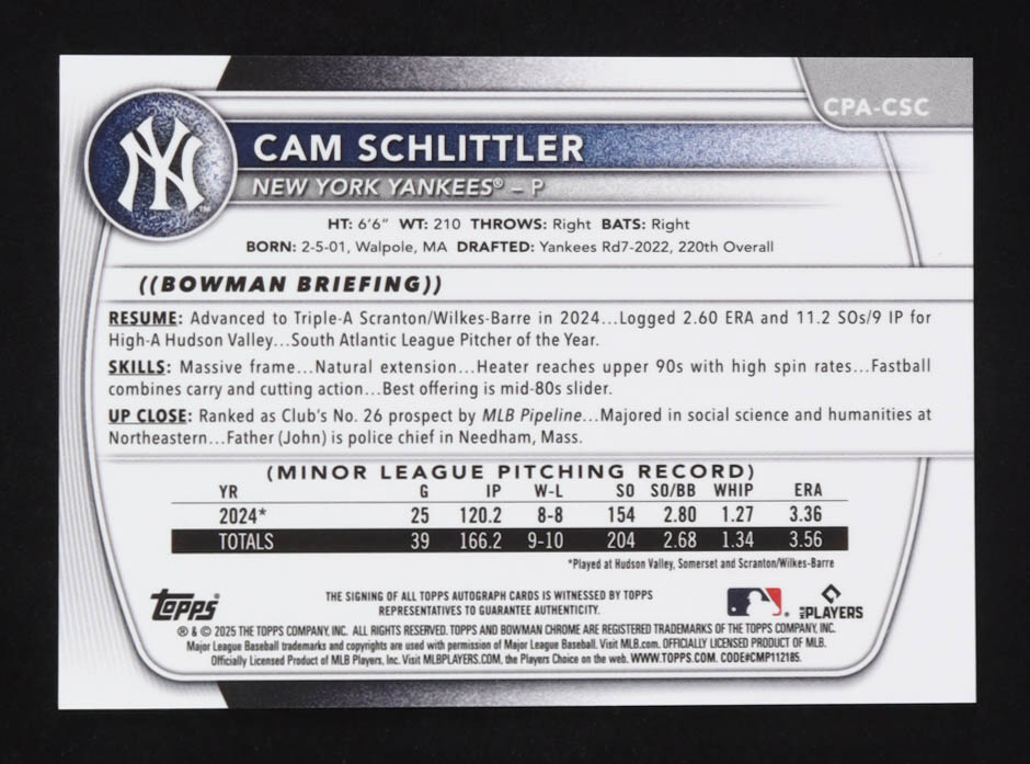 Cam Schlittler 2025 Bowman Chrome Prospect Autographs Mini-Diamond Refractors #CPACSC #024/100 RC