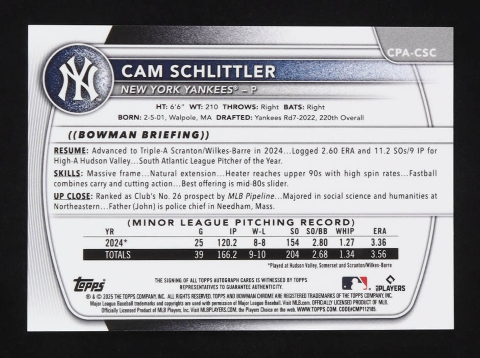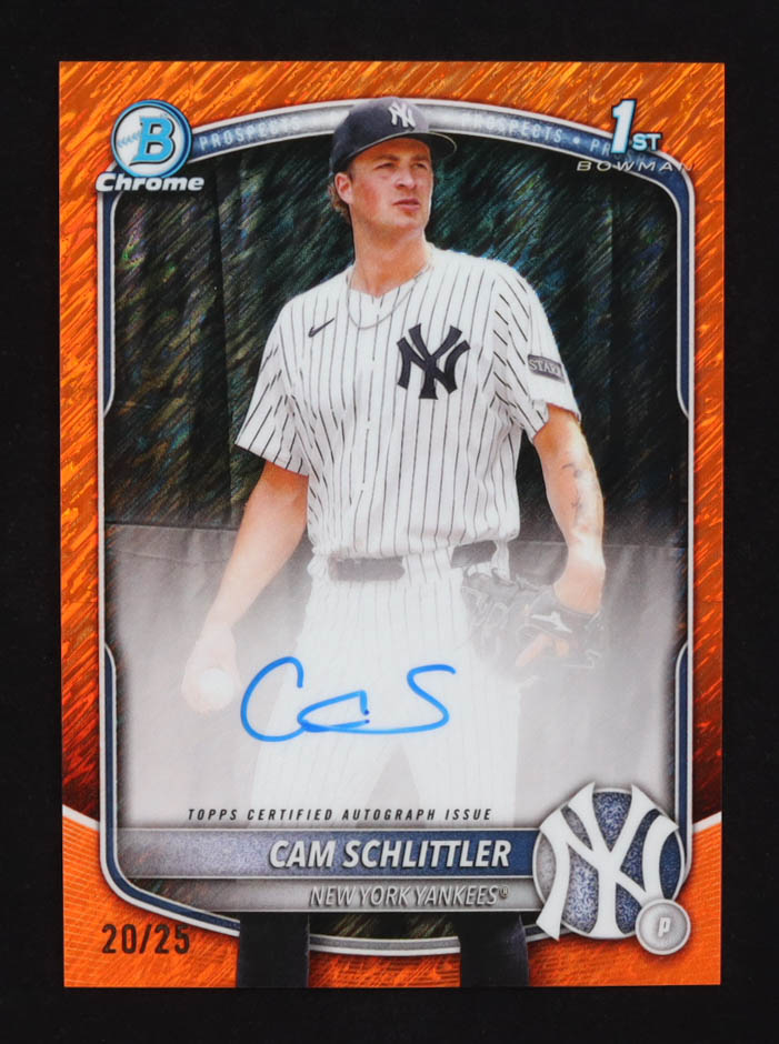 Cam Schlittler 2025 Bowman Chrome Prospect Autographs Orange Shimmer Refractors #CPACSC #20/25 RC