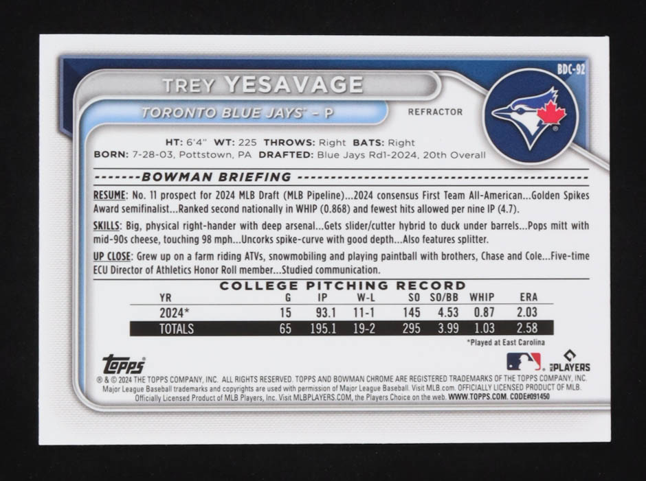 Trey Yesavage 2024 Bowman Chrome Draft Refractors #BDC92 RC
