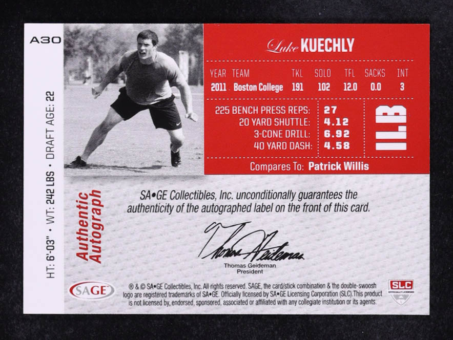Luke Kuechly 2012 SAGE Autographs Red #A30 RC