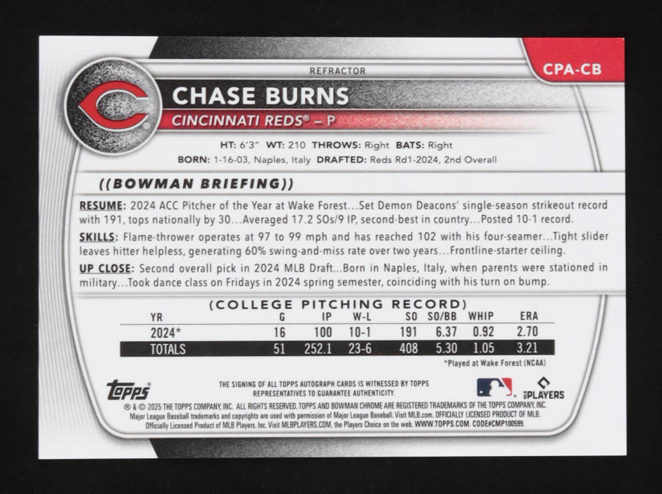 Chase Burns 2024 Bowman Chrome Draft Autographs Refractors #CPACB #293/499 RC