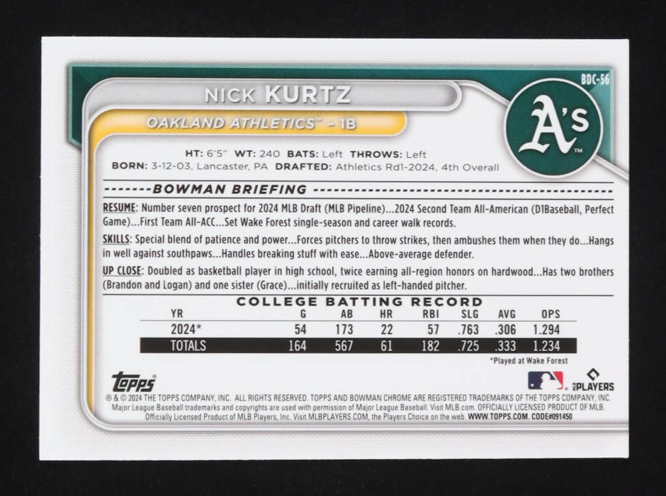 Nick Kurtz 2024 Bowman Chrome Draft Blue Refractors #BDC56 #121/150 RC