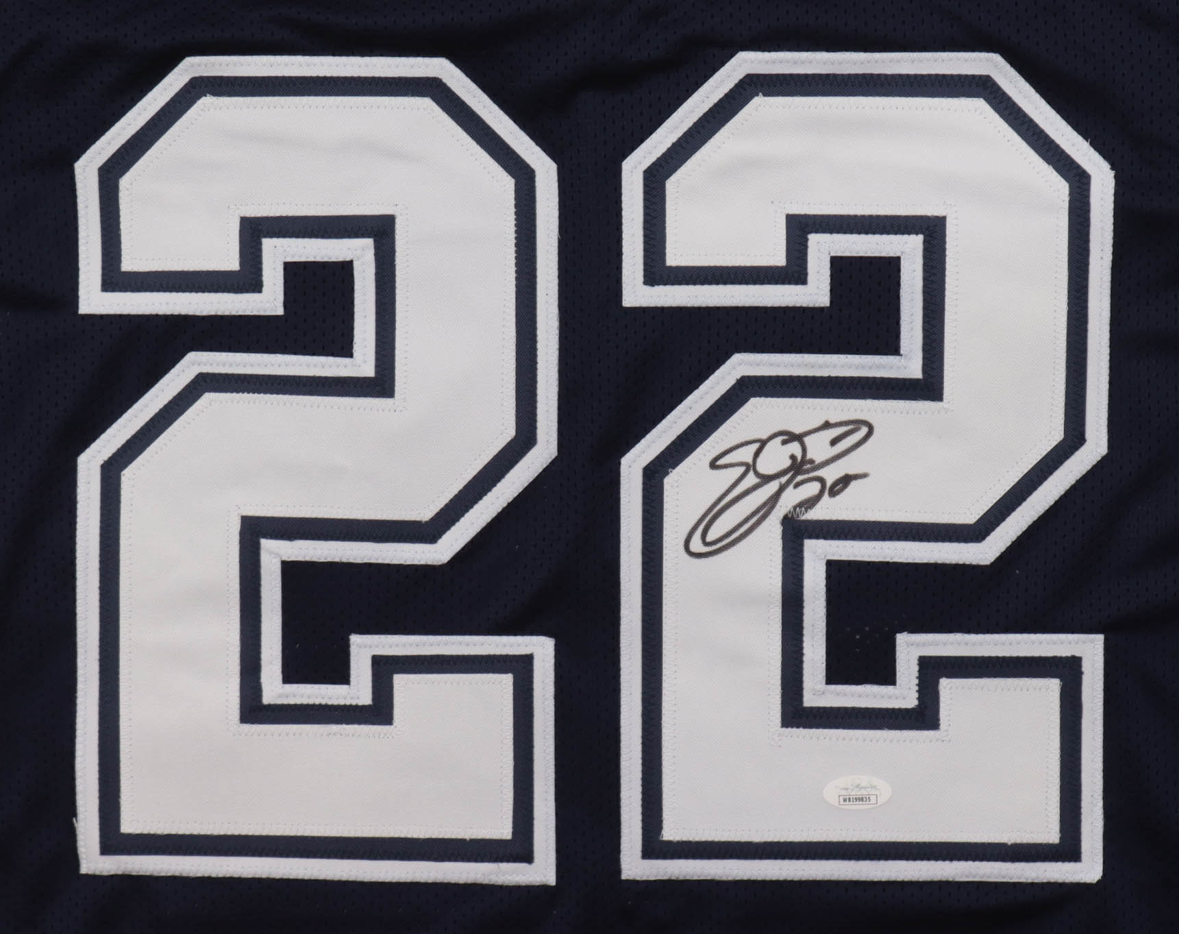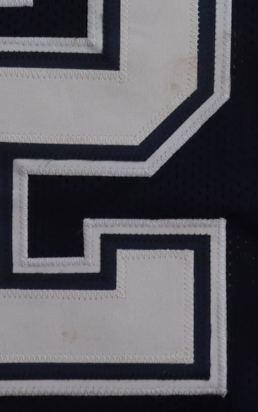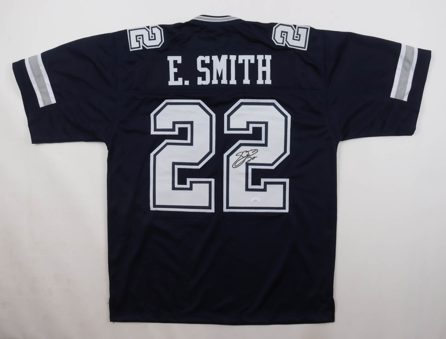 Custom jersey with everything sewn on, size XL. Hand-signed by Emmitt Smith (Dallas Cowboys, HOF). Please note, the front numbers are stained.