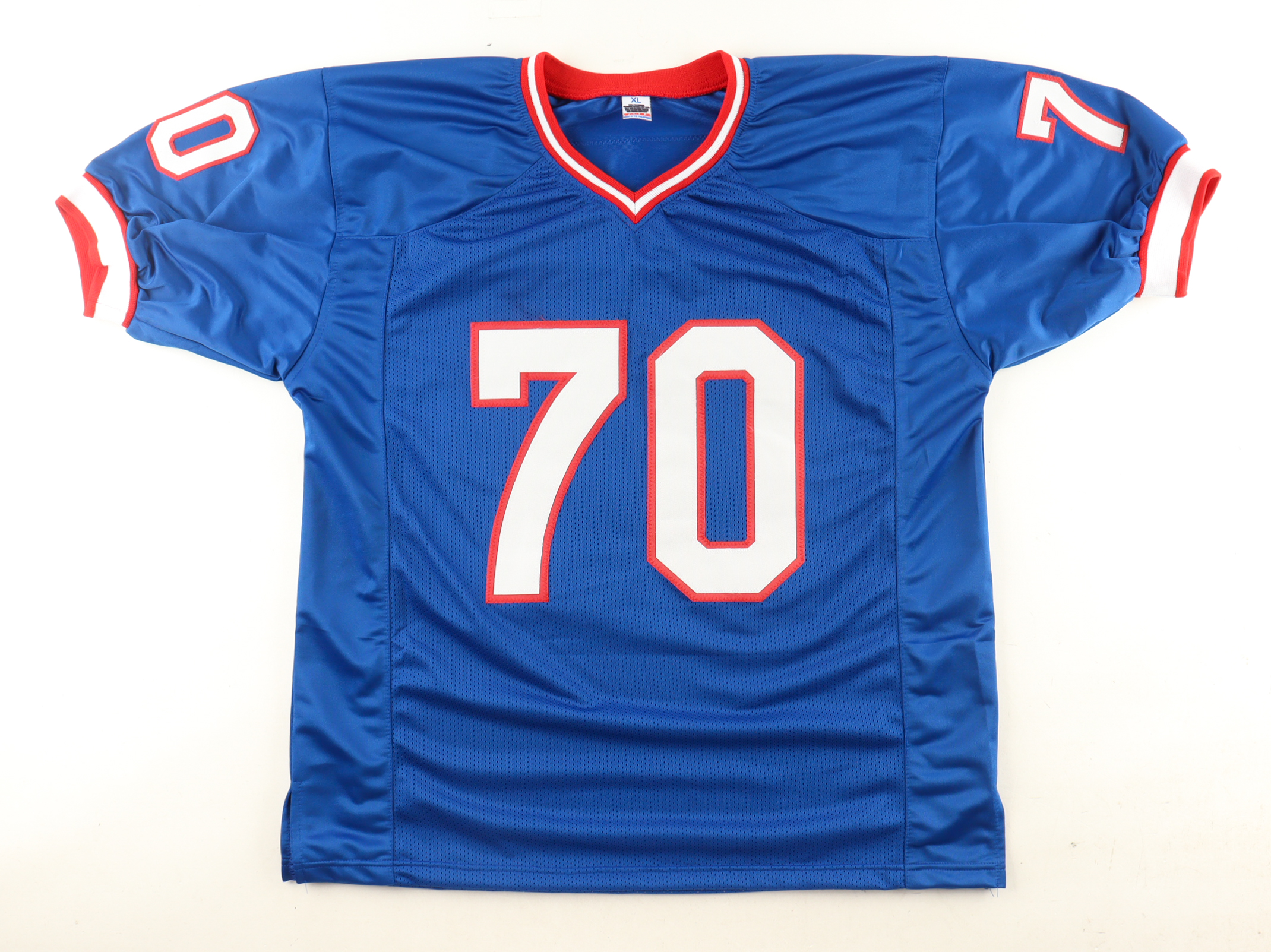 Custom jersey with everything sewn on, size XL. Hand-signed and inscribed by John Fina.