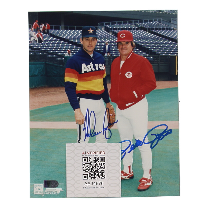 Photo measures 8" x 10" in size. Hand-signed by Nolan Ryan (Houston Astros, HOF) and Pete Rose (D. 2024, Cincinnati Reds).