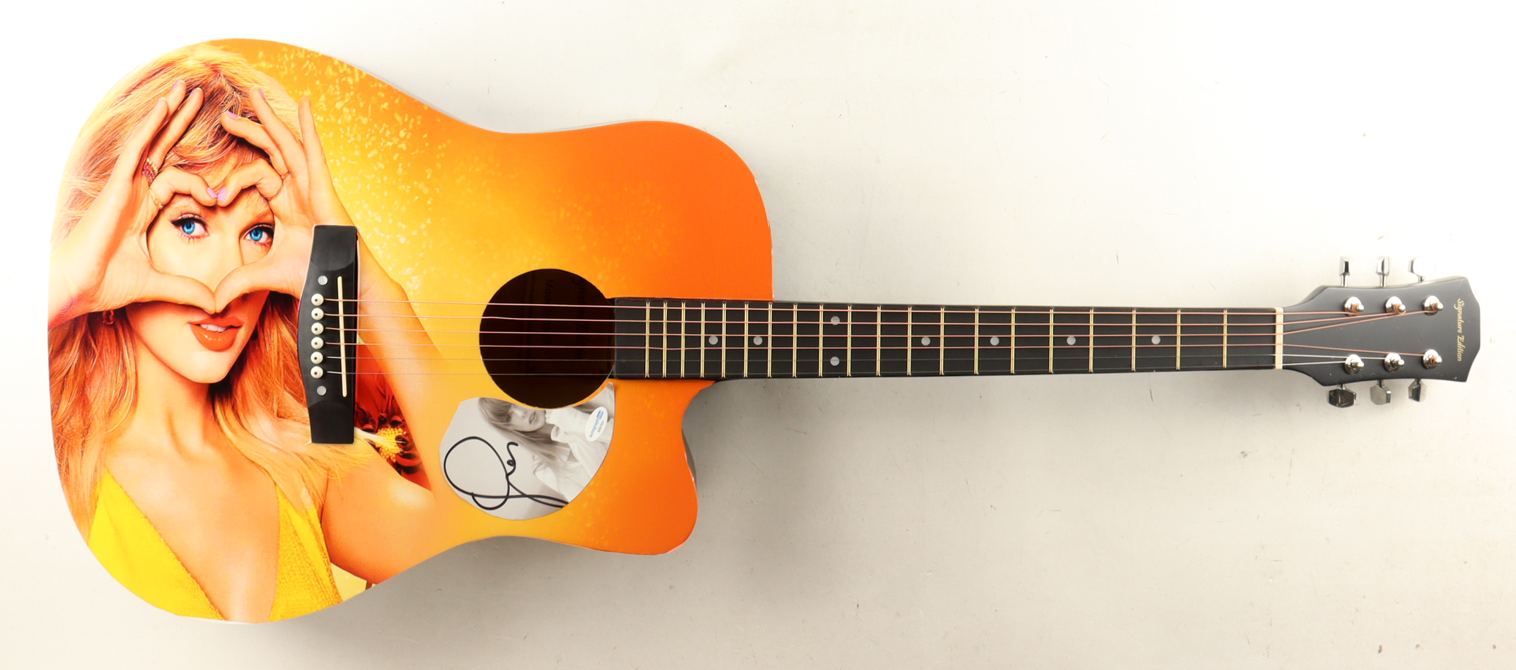 Signature Edition guitar measures approximately 39" in length and has been hand-signed by Taylor Swift on a CD insert that has been repurposed as a pickguard.