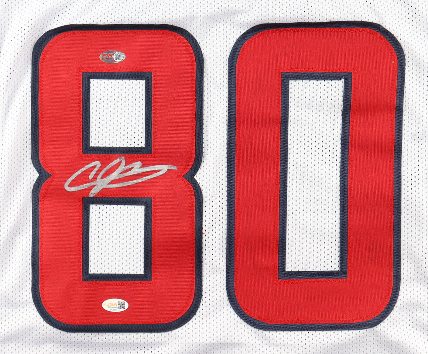 Custom jersey. Everything is sewn on, size XL. Hand-signed by Andre Johnson. Please note, the jersey is stained near the signature.