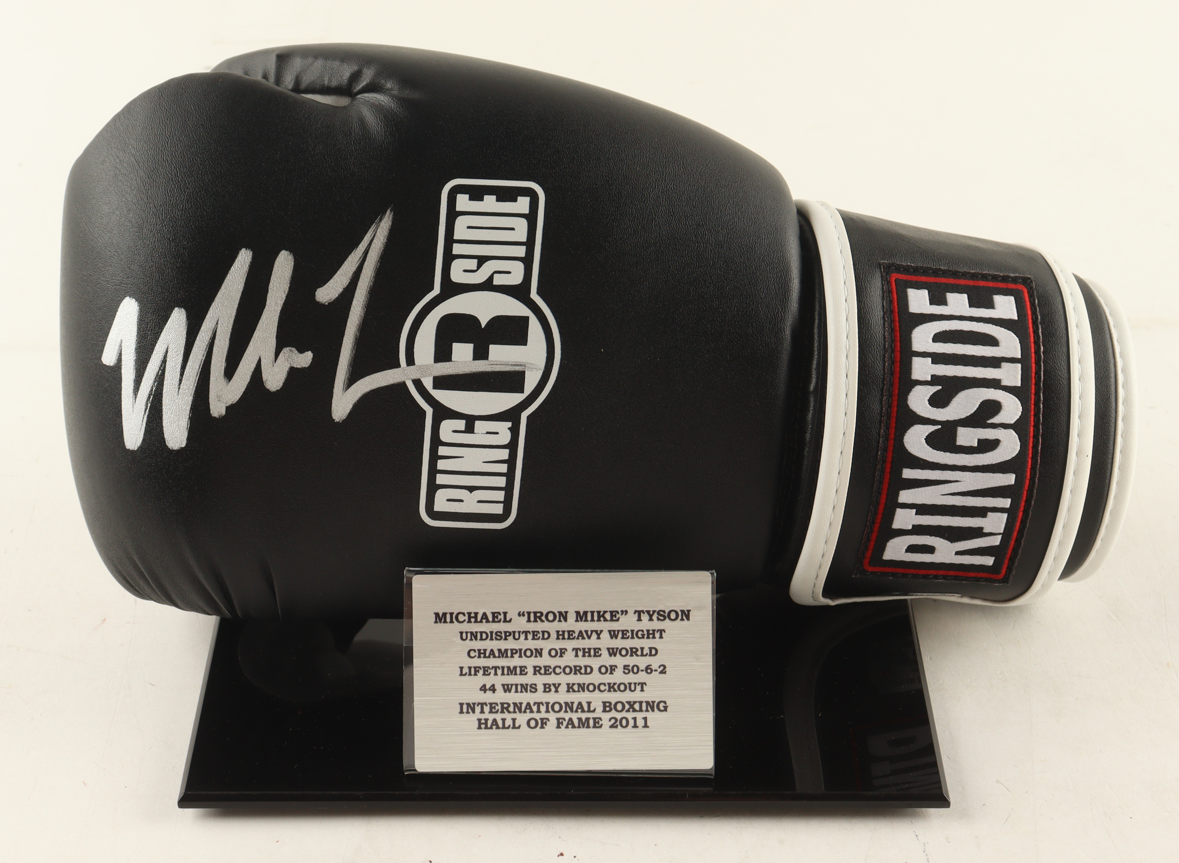 Ringside Boxing Glove. Hand-signed by Mike Tyson (HOF). Includes display stand as well as a full Mike Tyson career statistics plaque as shown.