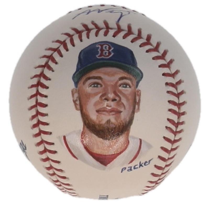Rawlings Official Major League baseball. Hand-signed by Alex Verdugo (Boston Red Sox). A portrait of the signer has been hand-painted by the artist, Gregg Packer.