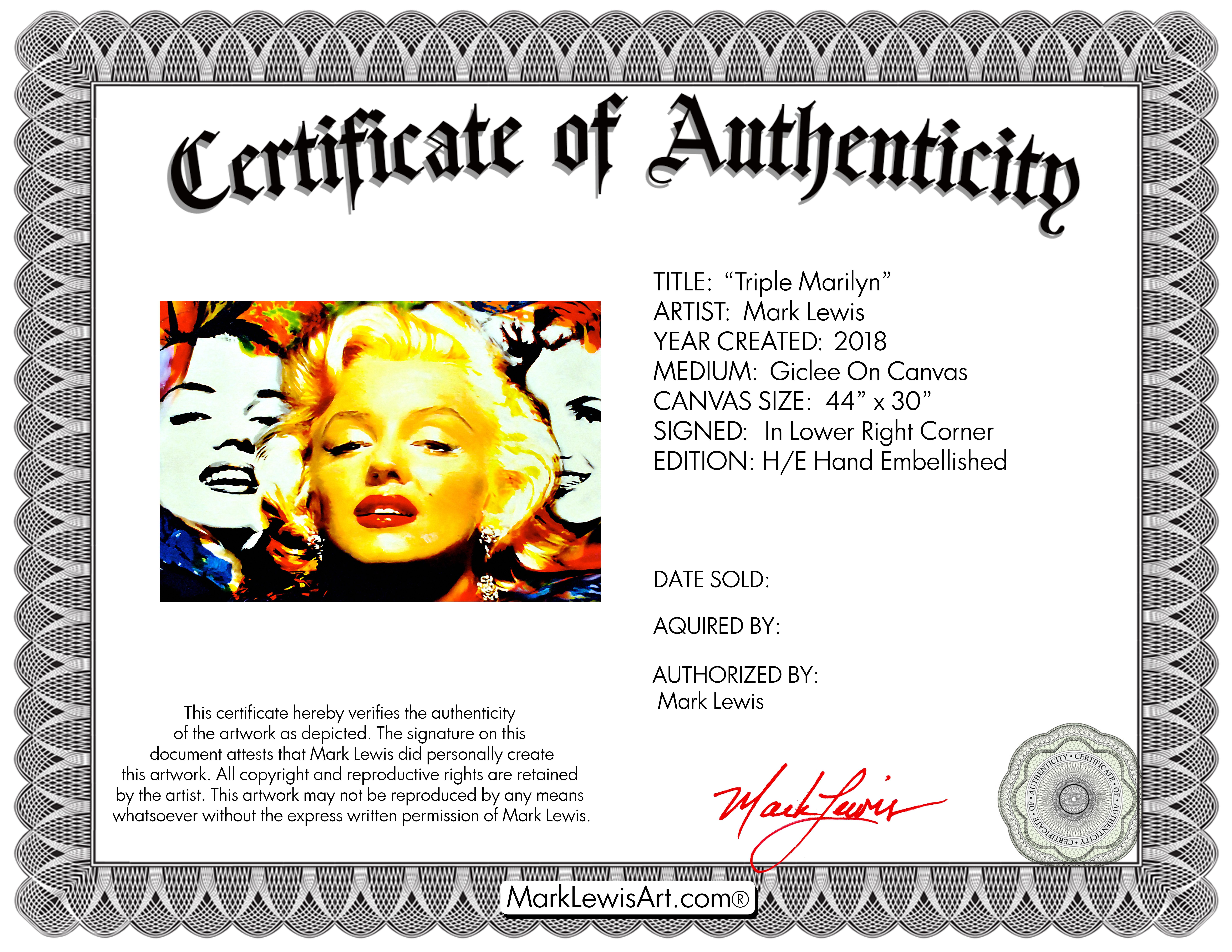 This original hand embellished painting on rolled canvas with HP ink, and gloss varnish on canvas that measures 30" x 44" and has been hand-signed and titled by the artist, Mark Lewis.