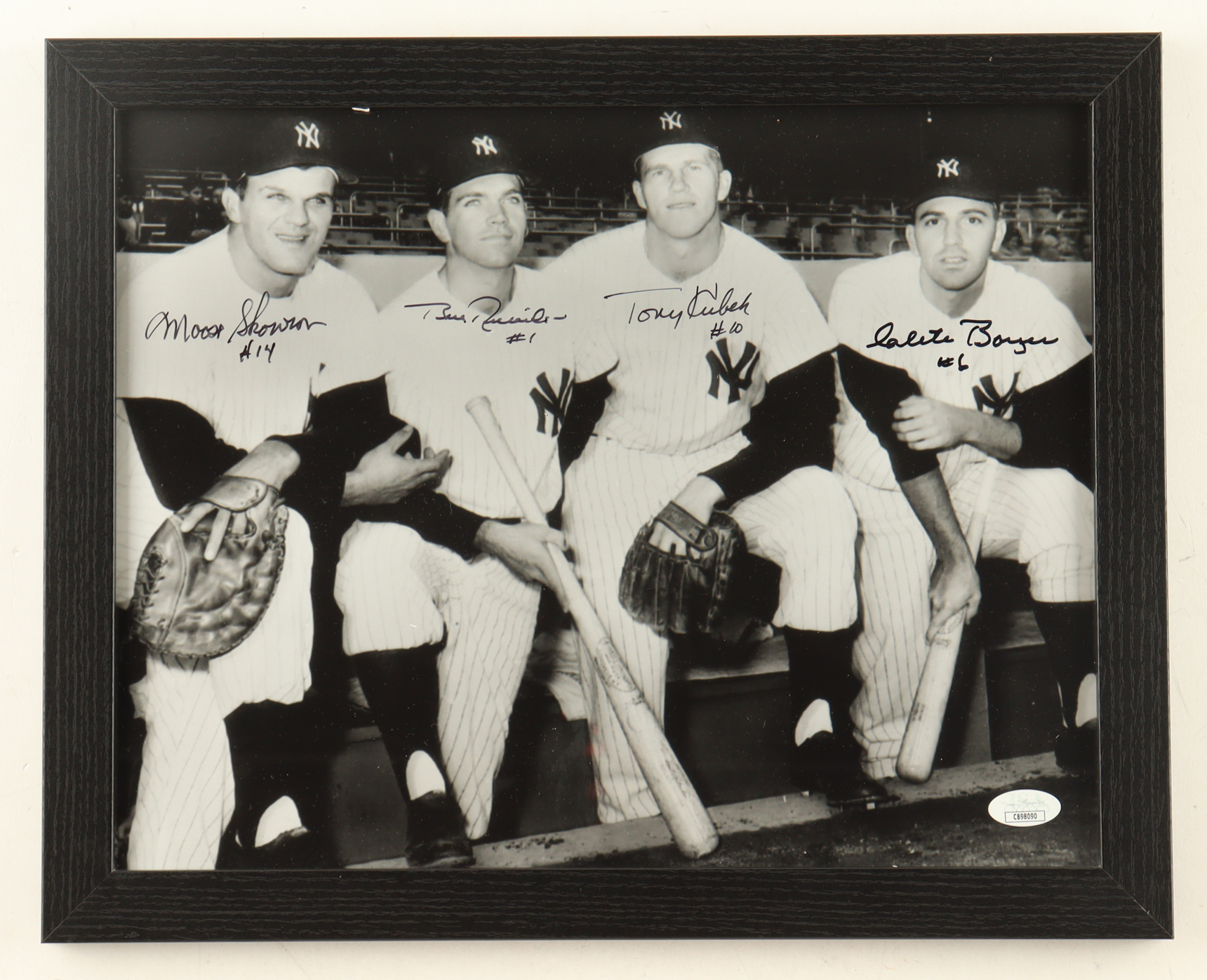 Custom frame measures 13" x 16" and features a black and white photo that has been hand-signed by (4) Tony Kubek, Clete Boyer, Bobby Richardson, and Moose Skowron. Refer to photo regarding the condition of the item.