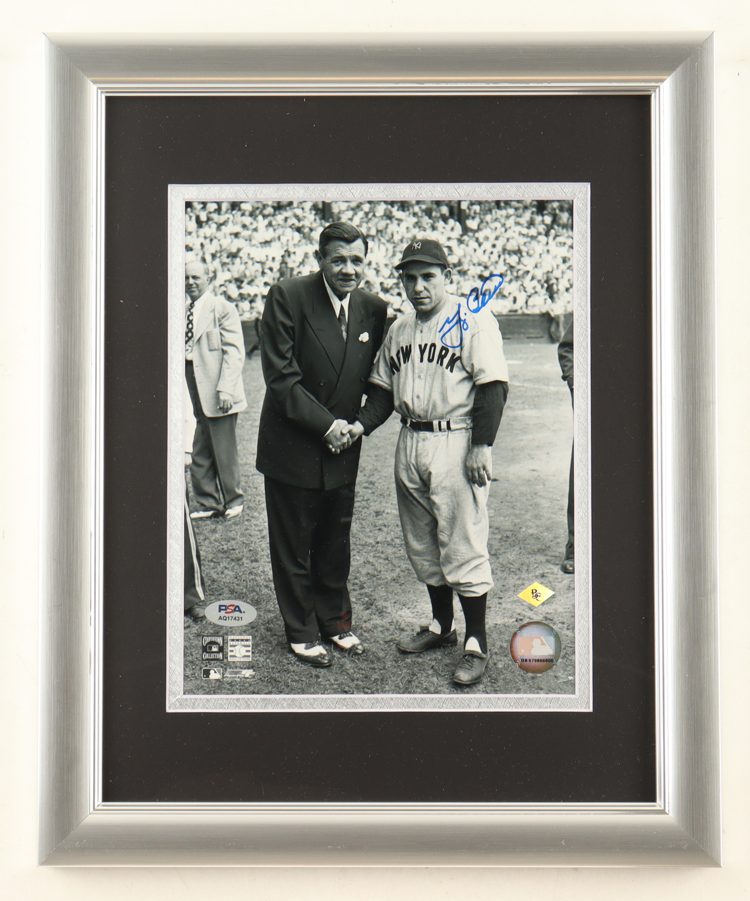 Custom frame measures approximately 13" x 16" in size and features a photo hand-signed by Yogi Berra (D. 2015, HOF).