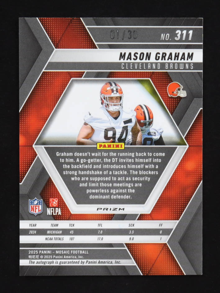 Mason Graham 2025 Panini Mosaic Rookie Autographs Mosaic Pink Spectris FOTL #311 #01/30 RC