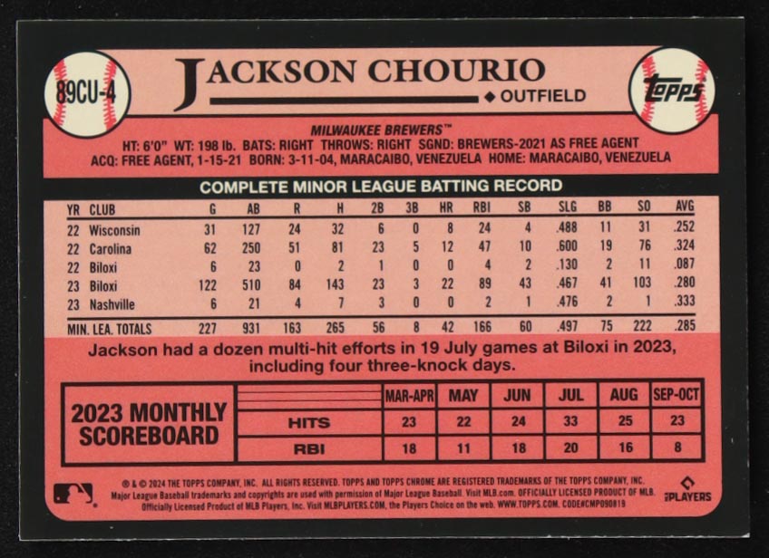 Jackson Chourio 2024 Topps Chrome Update '89 Topps #89CU4 RC
