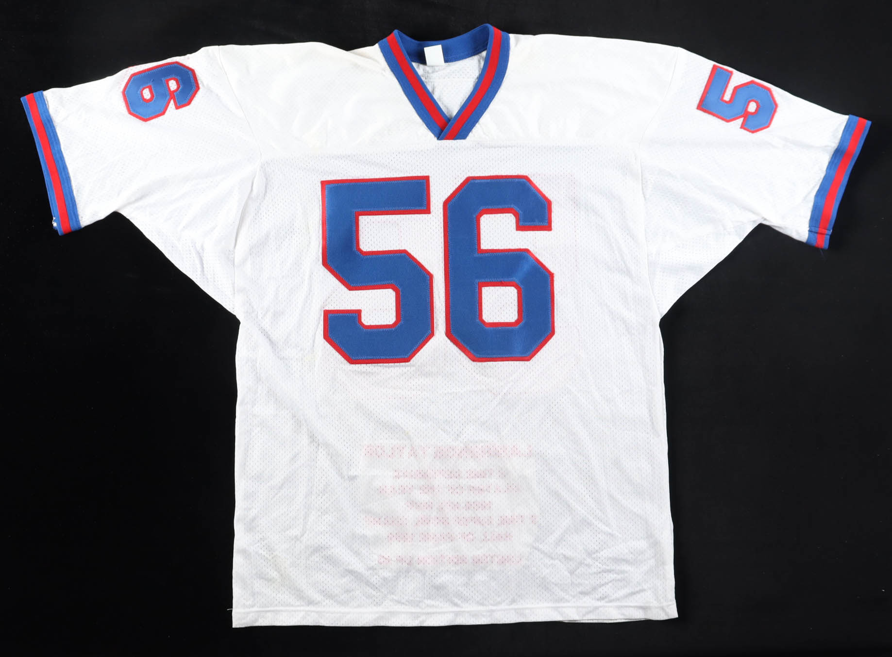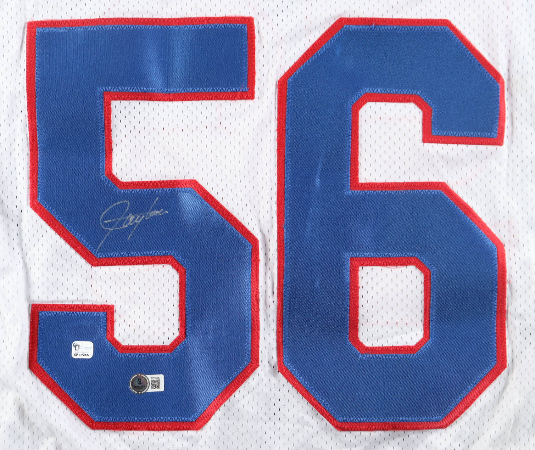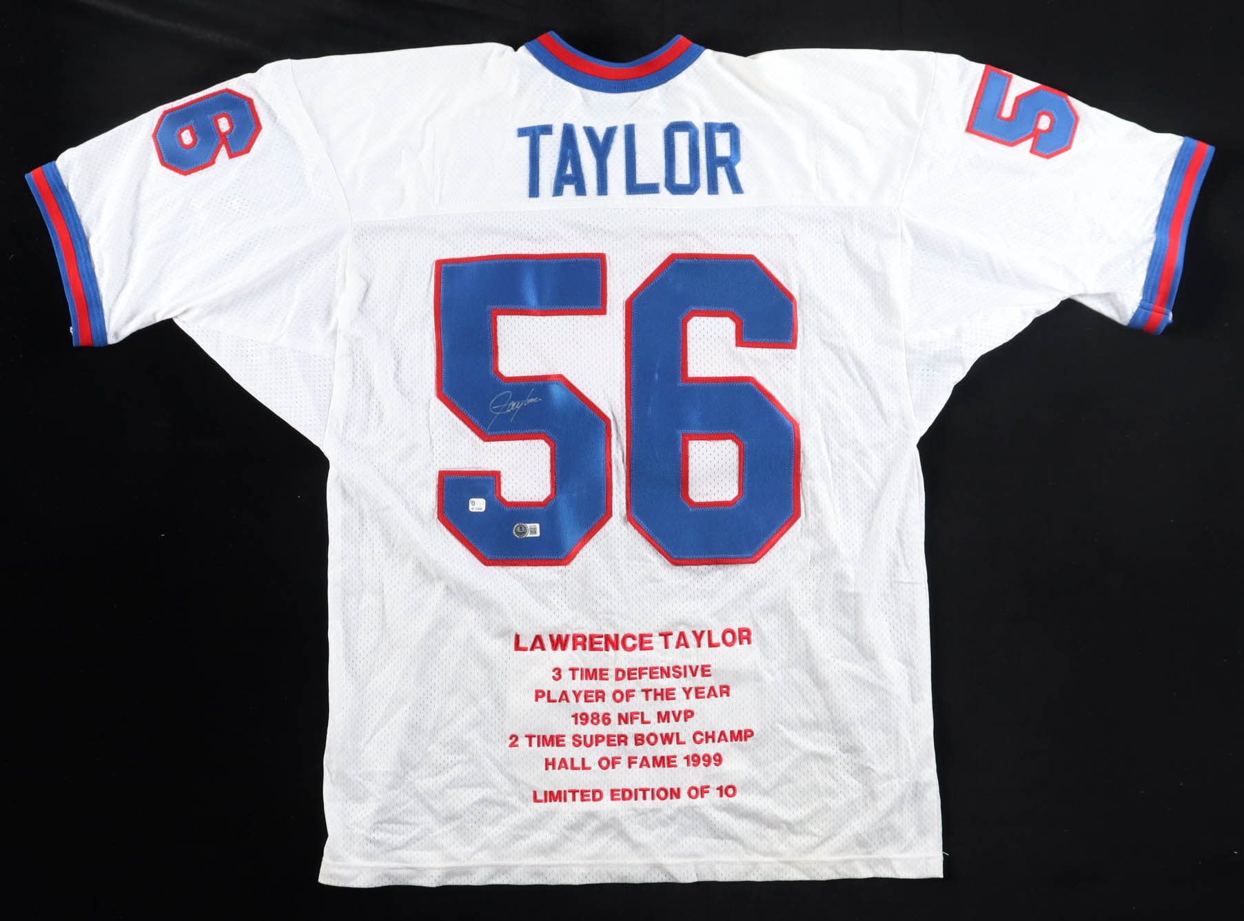 Custom jersey with everything sewn on, size 52. Hand-signed by Lawrence Taylor (HOF). Taylor's career highlights have been custom stitched onto the back of the jersey below the reverse numbers. The jersey is limited edition and is out of 10.