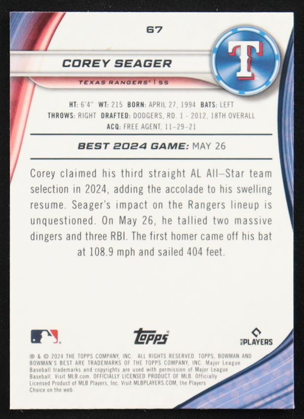 Corey Seager 2024 Bowman's Best Blue X-Fractors #67 #118/150