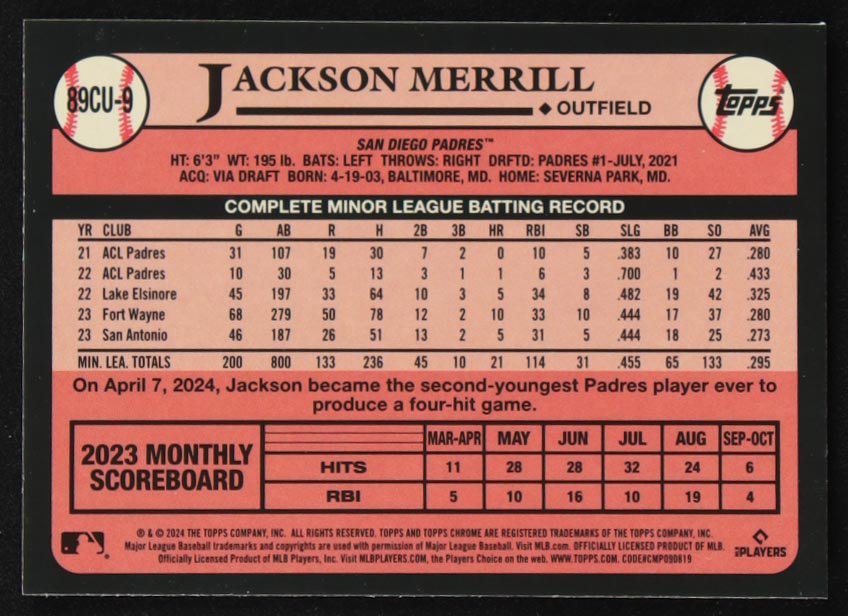 Jackson Merrill 2024 Topps Chrome Update '89 Topps #89CU9 RC